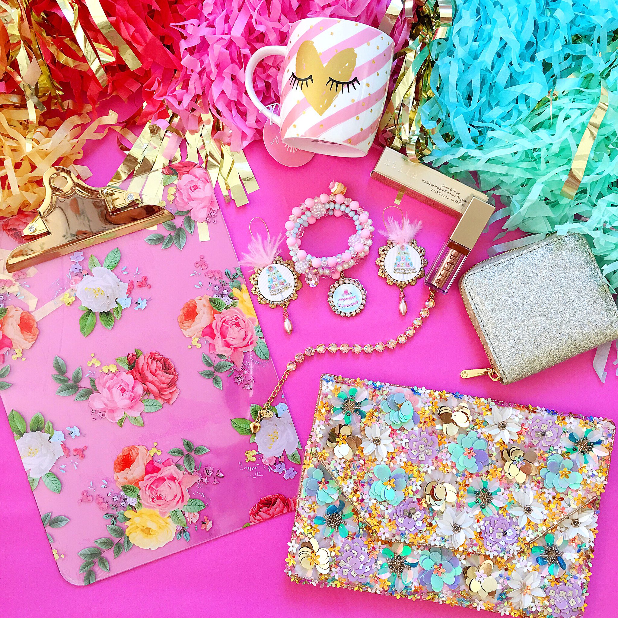 I’m also excited to include in the giveaway a pretty office floral clipboard ( I have one and use all the time), a little gold glitter wallet, eyelashes heart coffee mug, and my favorite product to use when I want a little extra glam.