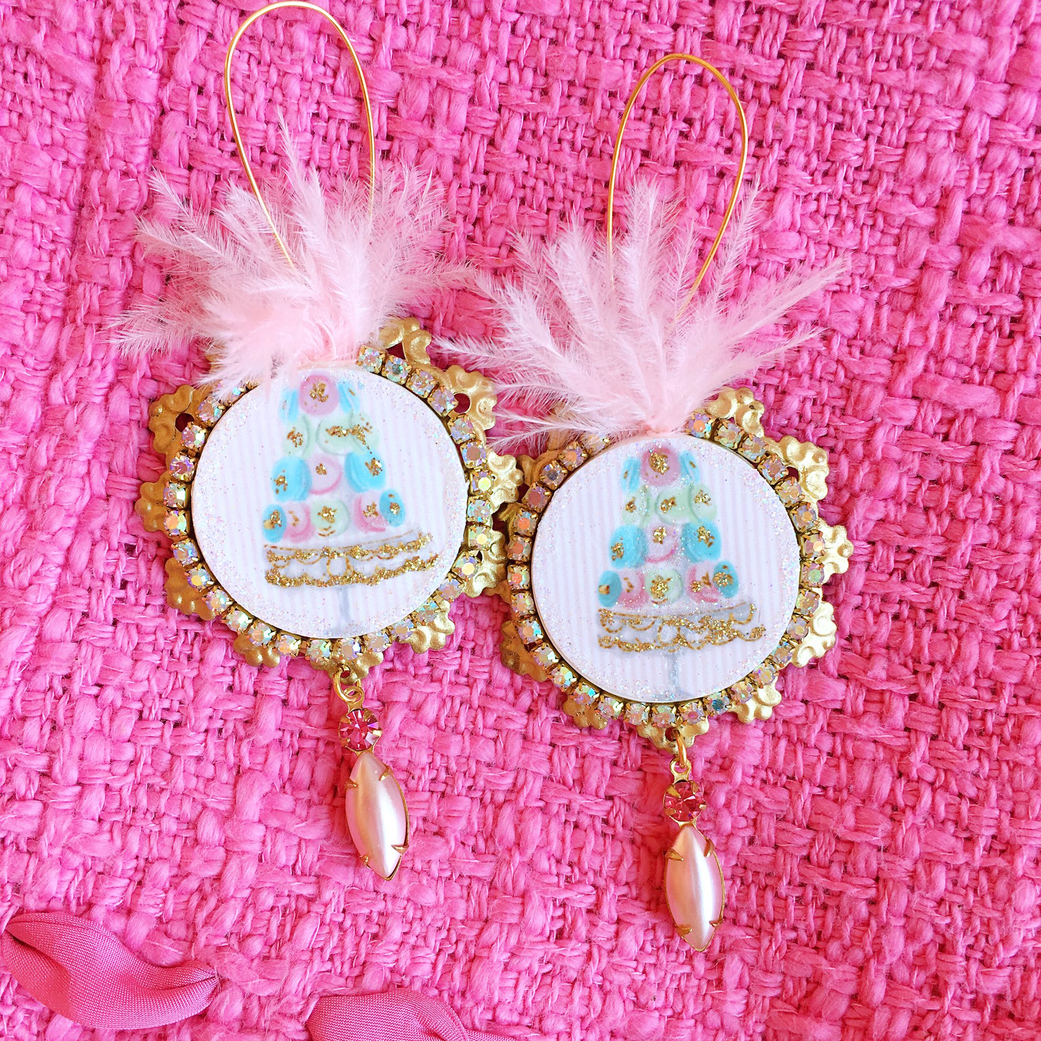 Ooh La La Macaroon earrings with pink feather toppers are fun statement pieces.