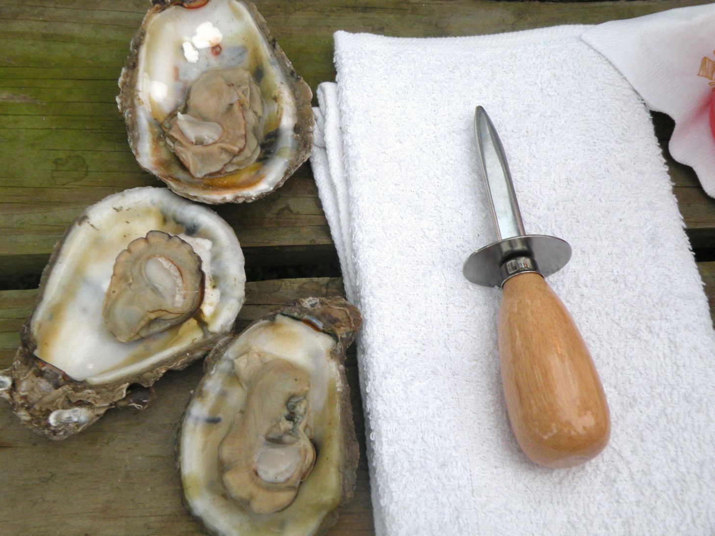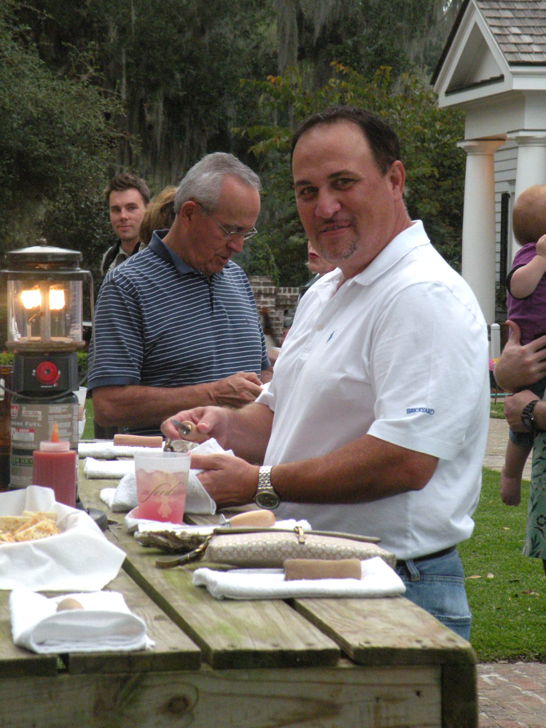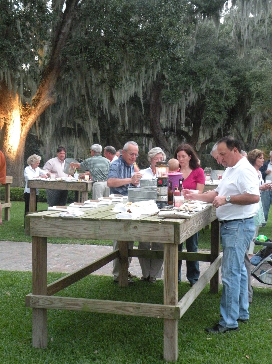 The lawn has long wooden tables set up with big ole buckets of Oysters ready to be shucked.