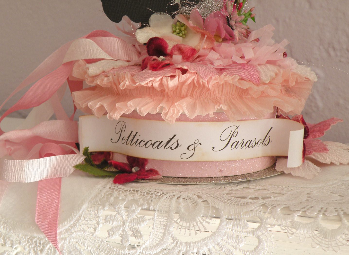 It's a decorative assemblage box with the banner "Petticoats & Parasols". This gorgeous pieces was handmade by the super talented Amada Lebel of Party Hats and Pretty Little Things. Amada will be attending my upcomming event, so I thought it was a really sweet idea that she created this piece inspired by my event.