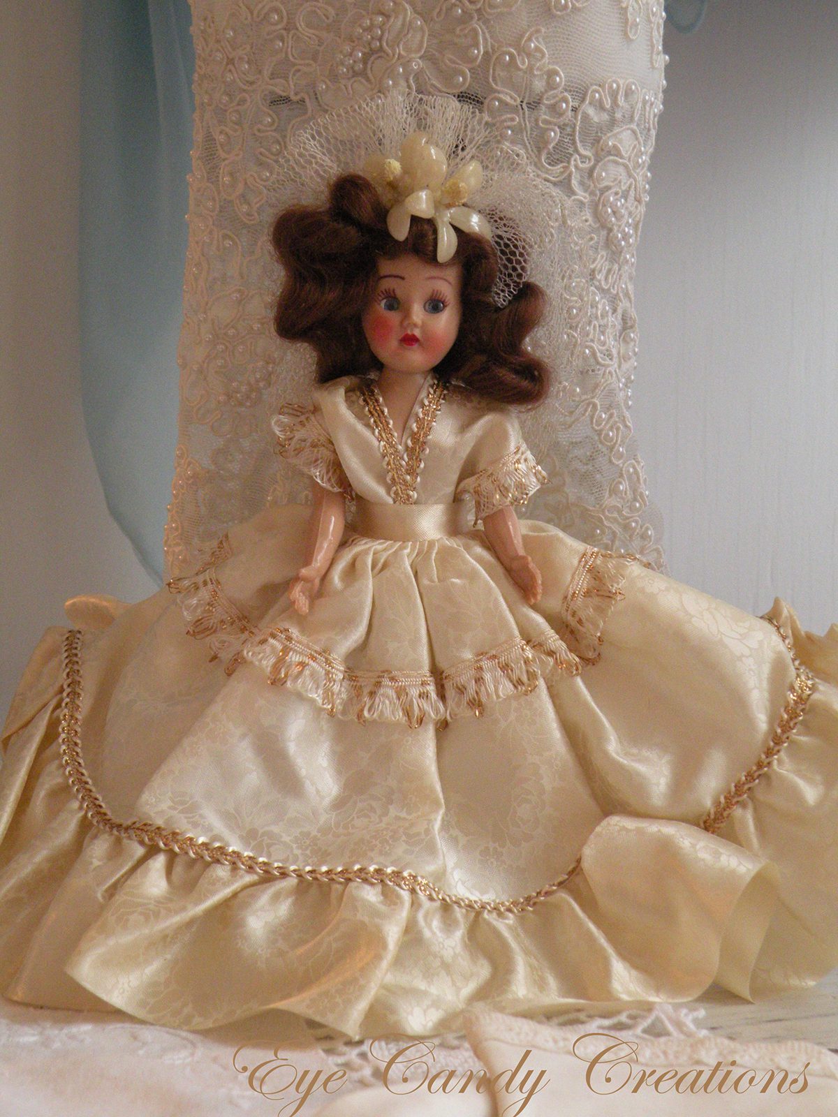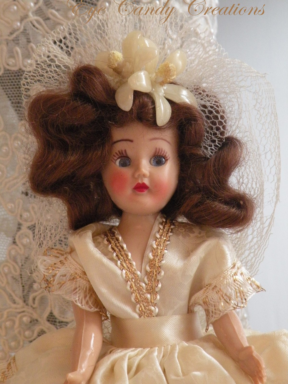 Squeeel!!!! I receieved another VERY unexpected box yesterday from Miss Kim Caldwell. She found this GORGEOUS bride doll and instantly thought of me. I have a rather large collection of these dolls and hands down she has to be one of the prettiest! She has the perfect red lips, eyelashes, and sweet pink cheeks!