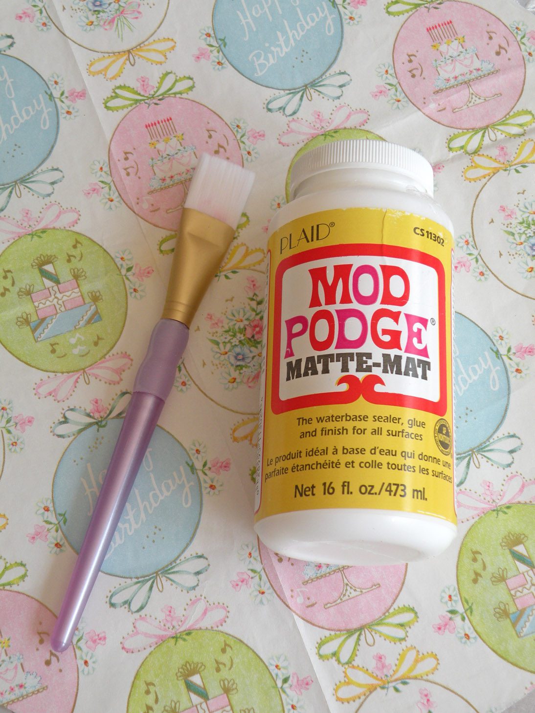 – Next I put a light coat of Mod Podge sealer and glue on top. The wrapping paper I use is vintage and very thin, so I try not to use too much otherwise it will tear easily.