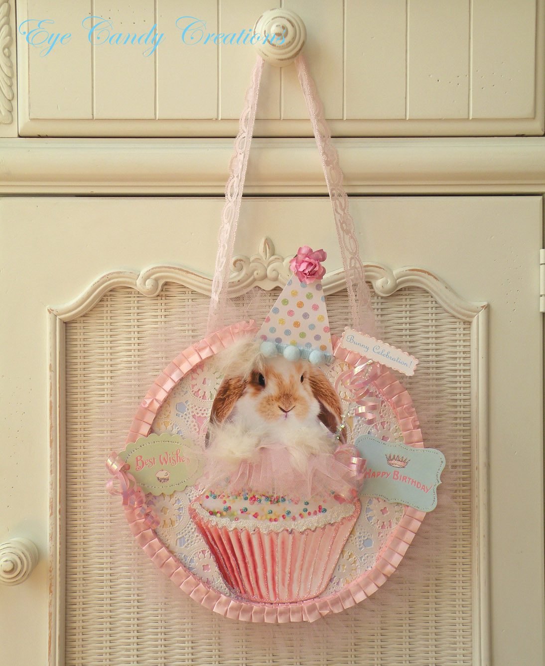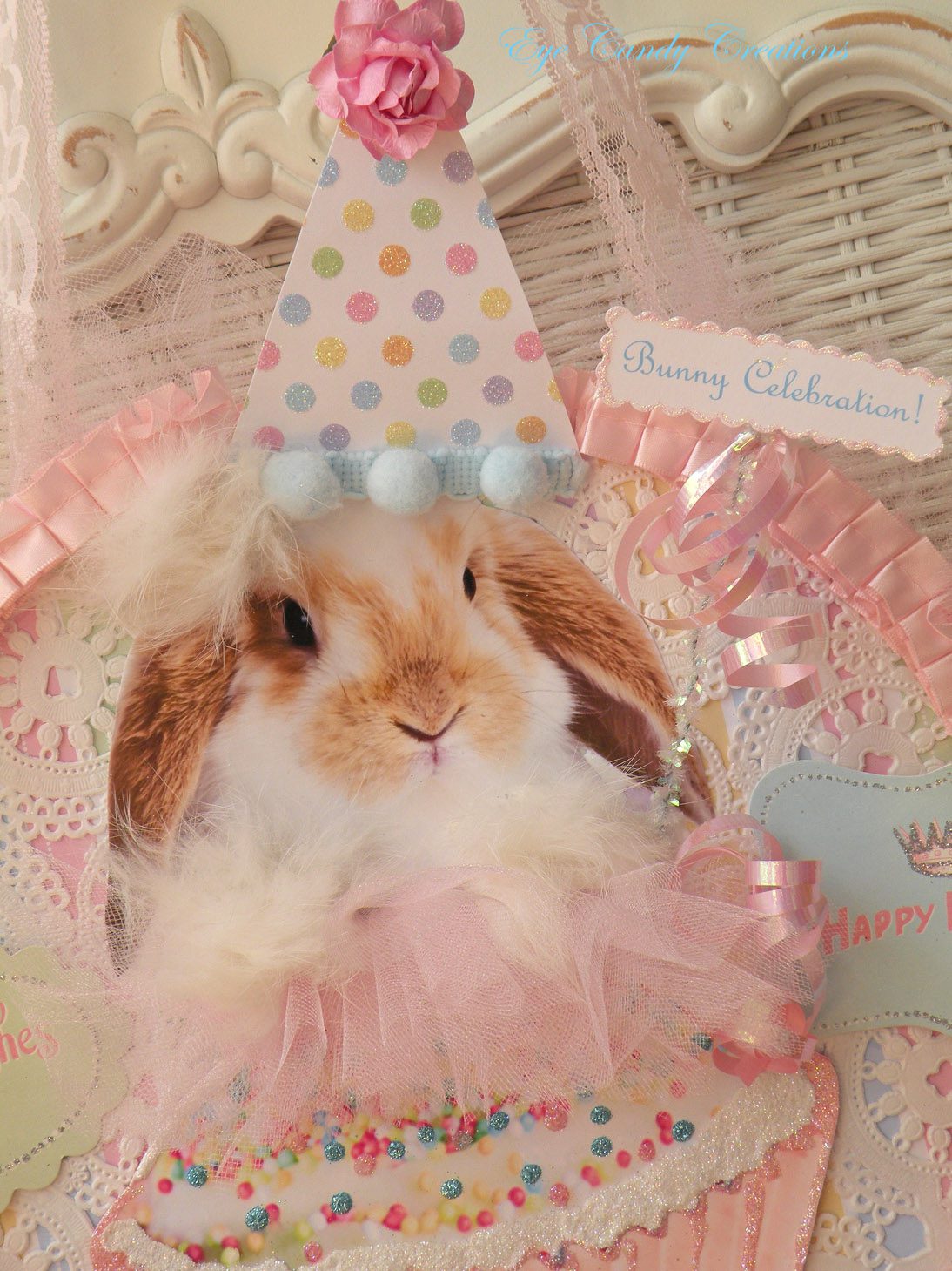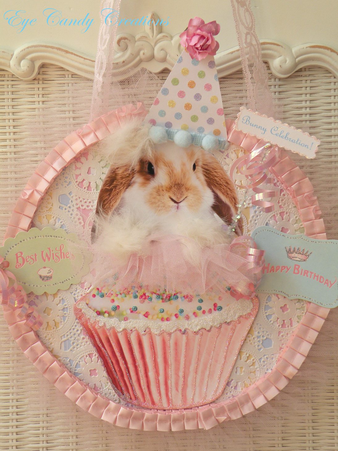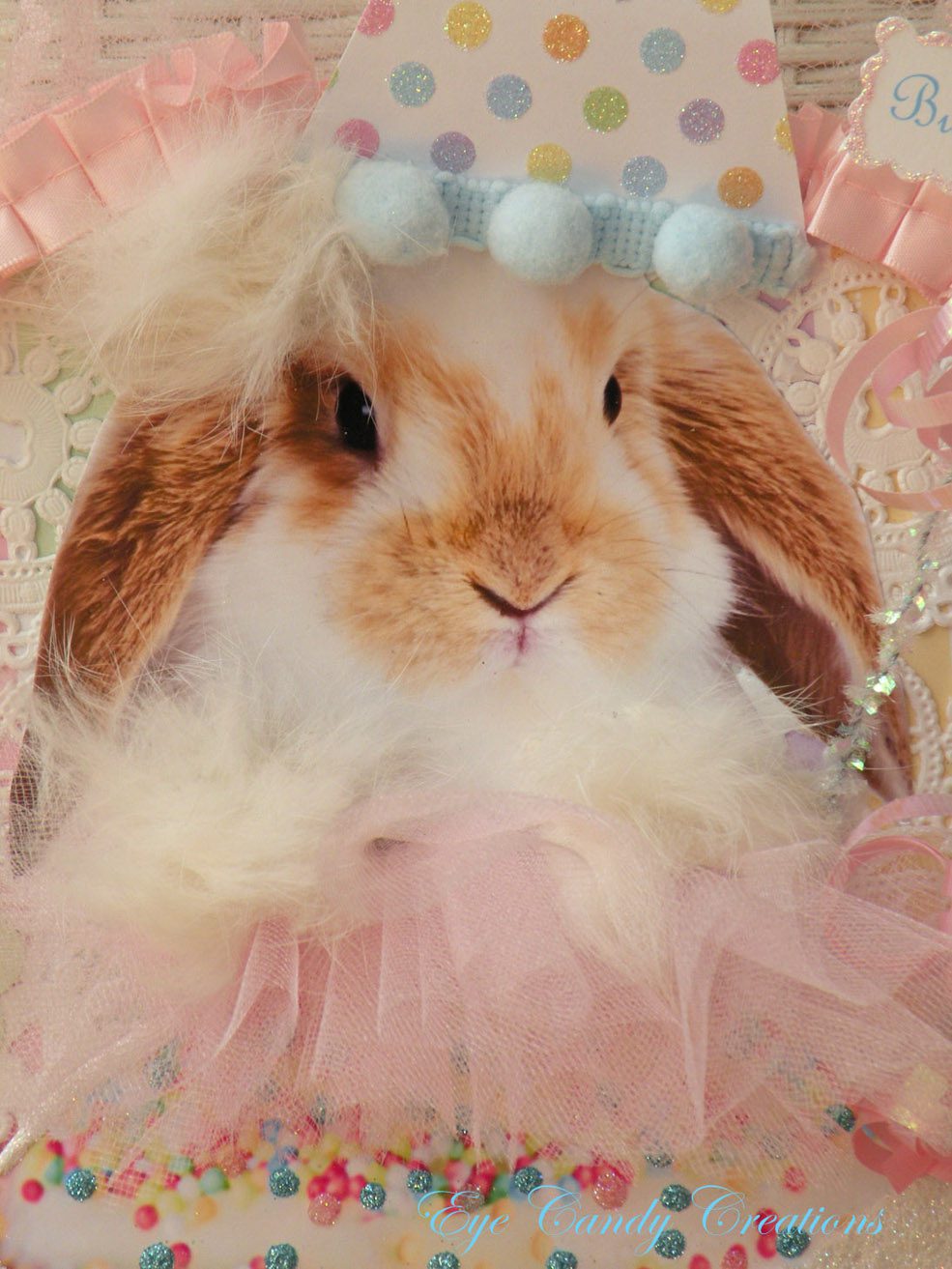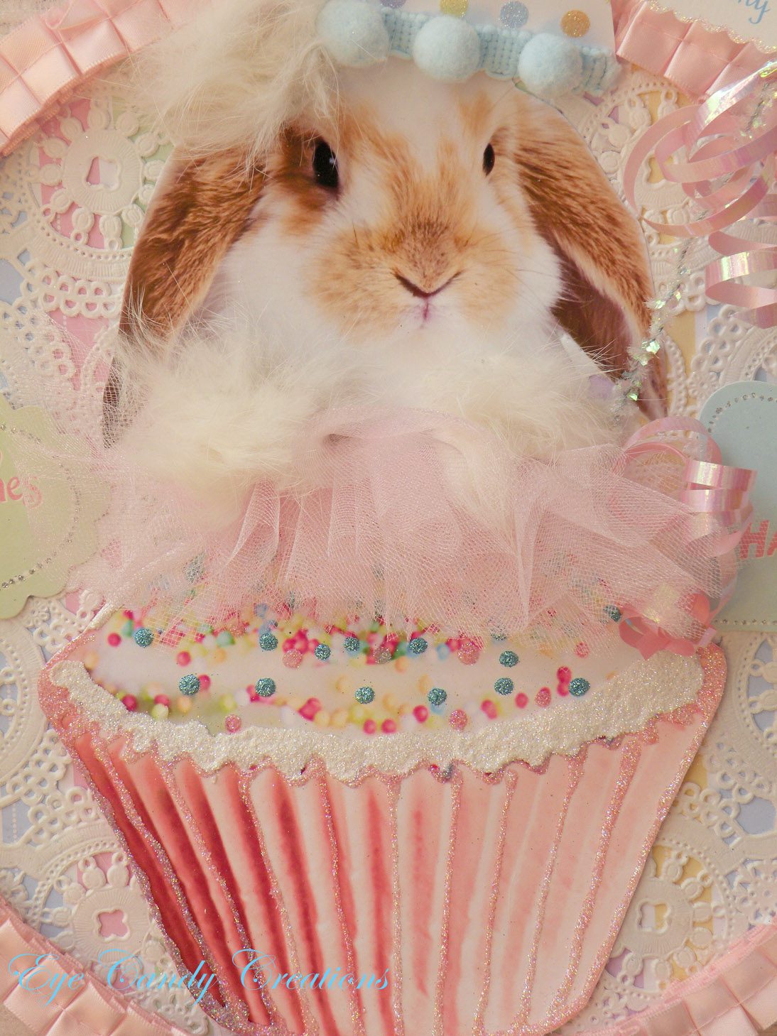 Sweet bunny in her party hat and pink tutu sitting atop a glittery cupcake. Cuteness overload!!!!