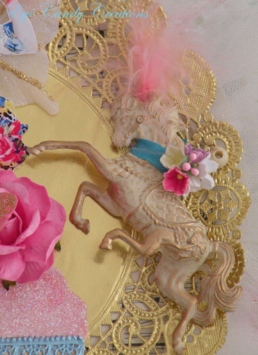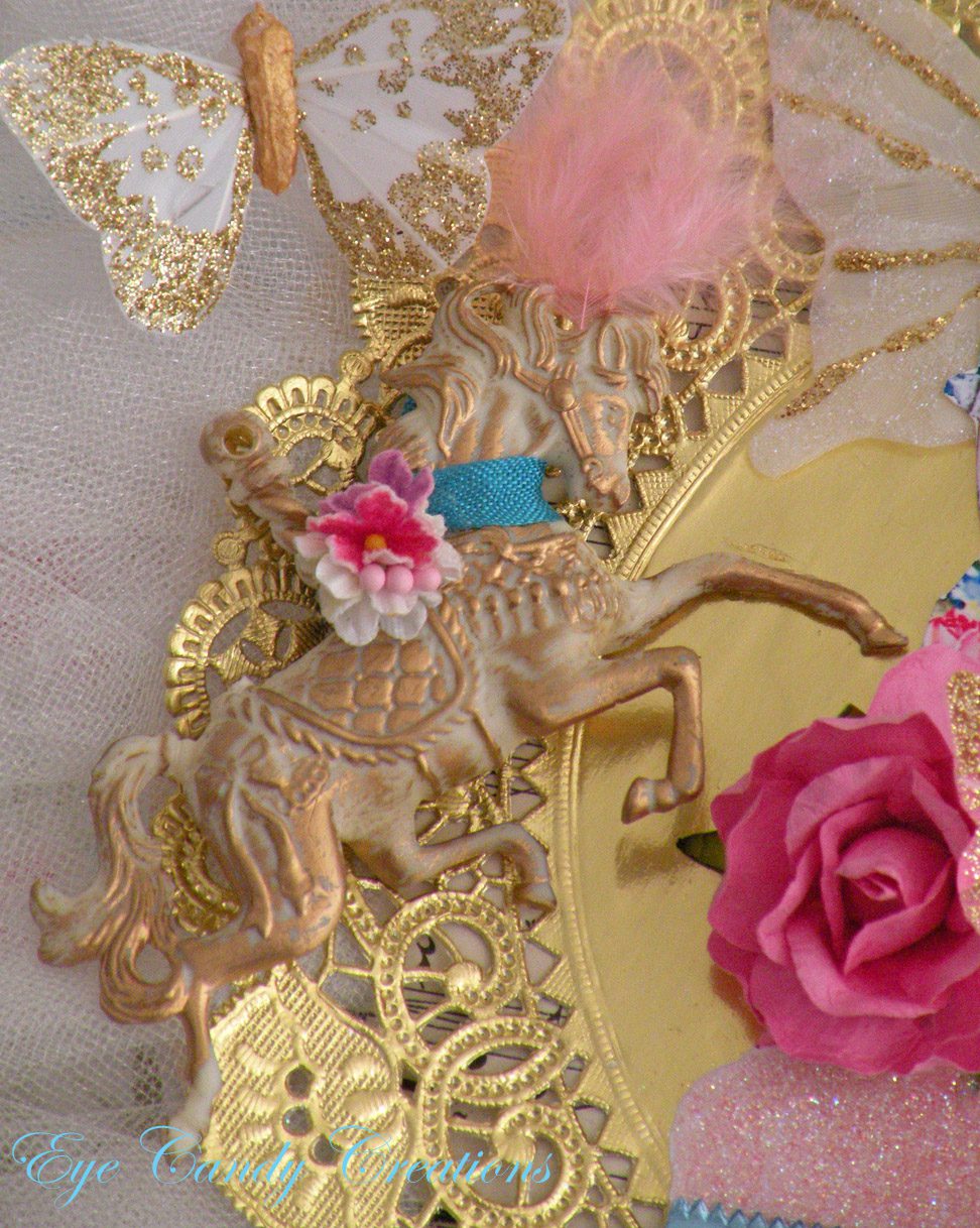 The collage is adorned with gilded gold carousel horses and butterflies.