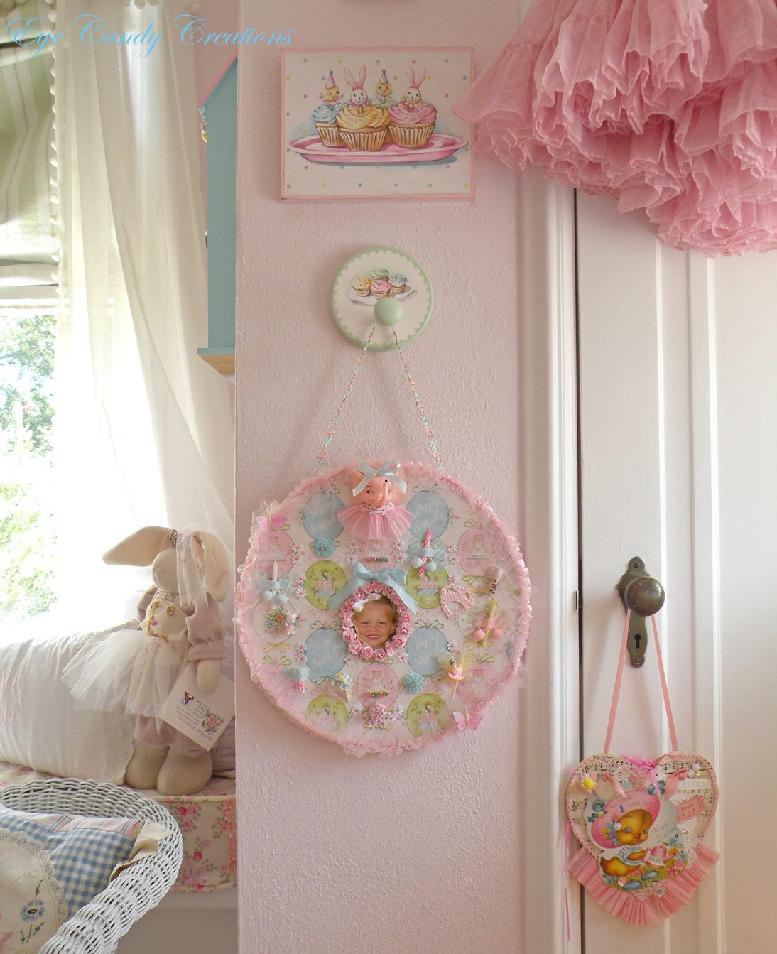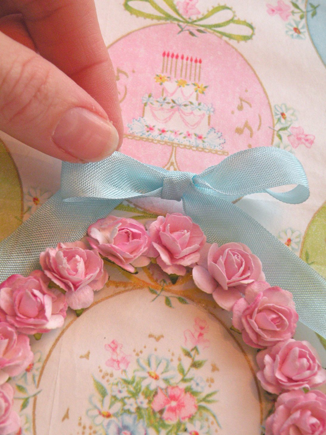 Glue some pretty trim to the back of the round frame and now Caroline's whimsy, pretty, and festive collage is now ready to hang!