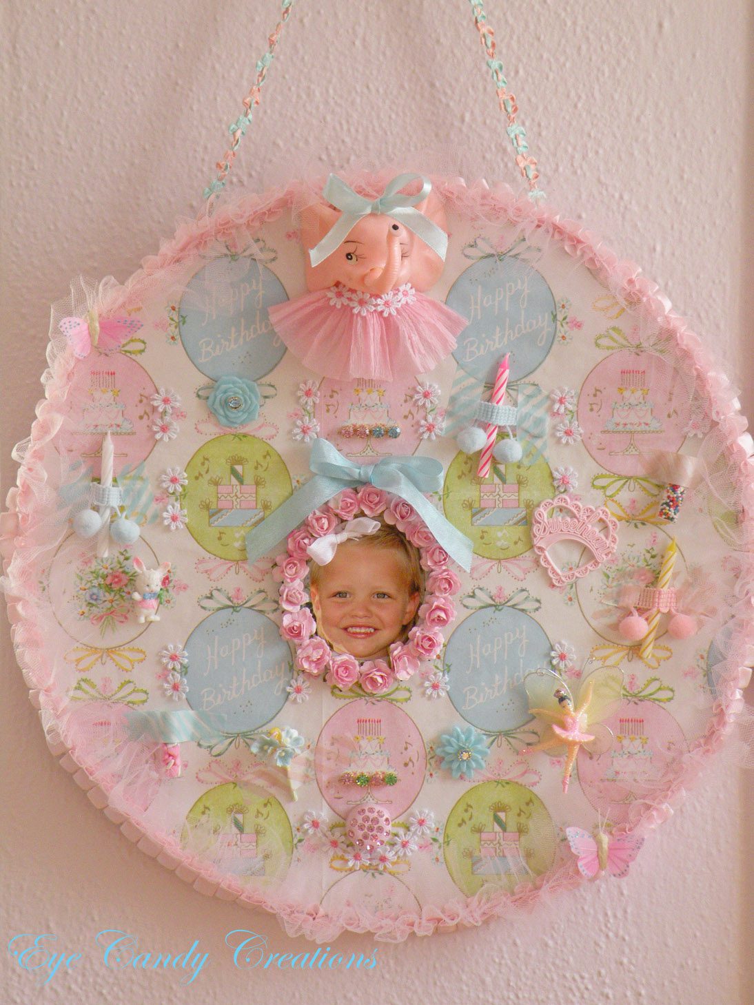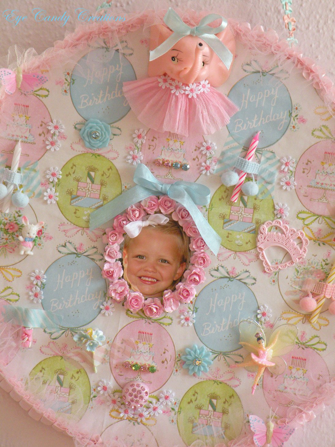 Caroline just celebrated her 3rd birthday, and the theme was pink elephants! SOOO PRECIOUS!!! I thought it would be fun to make a picture collage with itty bitty sweet bits adorned to the frame.