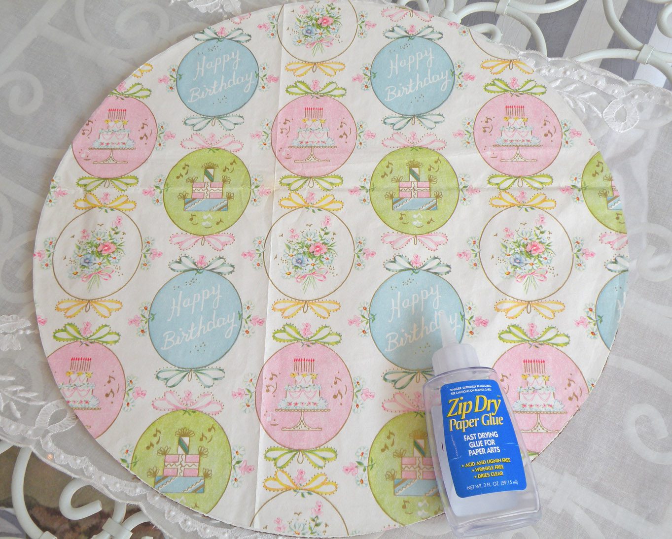 – Cover the round cake circle with vintage wallpaper, wrapping paper, ledger, music sheet…whatever you heart desires! I like to use Zip Dry. LOVE this stuff!