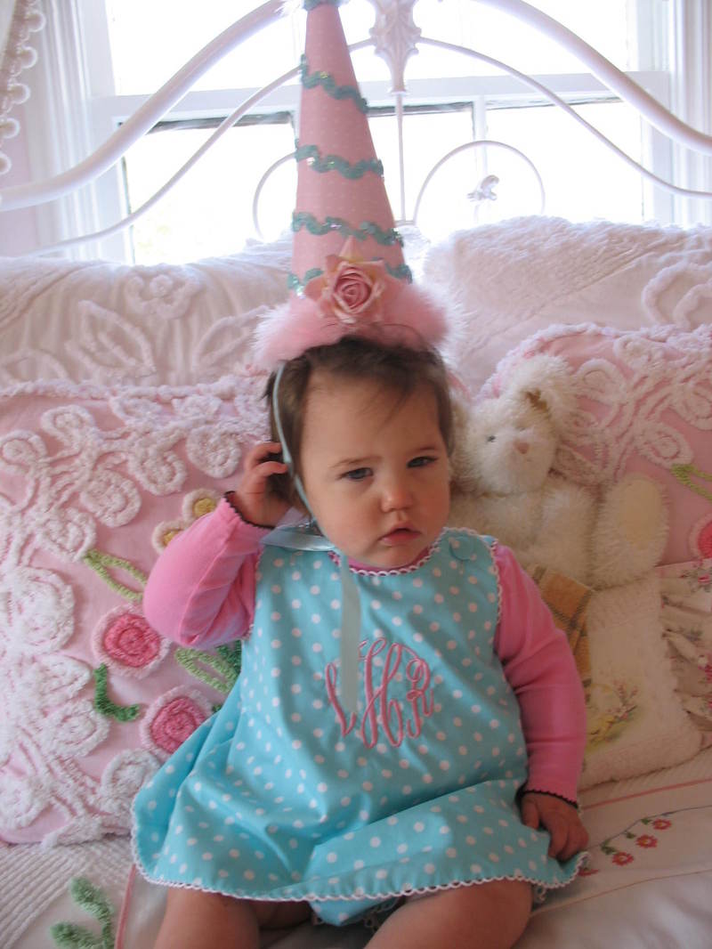 We planned a small family get together for her FIRST birthday. When planning everything I freaked when I realize that I didnt PURCHASE a pink froofy party hat for her, so within 15 minutes of family arriving I quicky assembled a party hat to match her outfit. I think it turned out pretty darn cute for putting it together in 15 minutes. This is my first hat I’ve ever made! YIPPEE!!!!