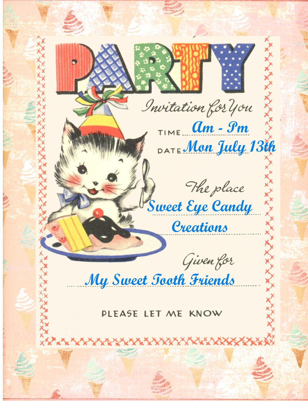 Grant, Vivian and I will be hosting a fun ice cream party and we want you to join us!!! We'll be setting up our own little make-shift ice cream parlor. :) Have fun and get creative!!! Take lots of pics!!!