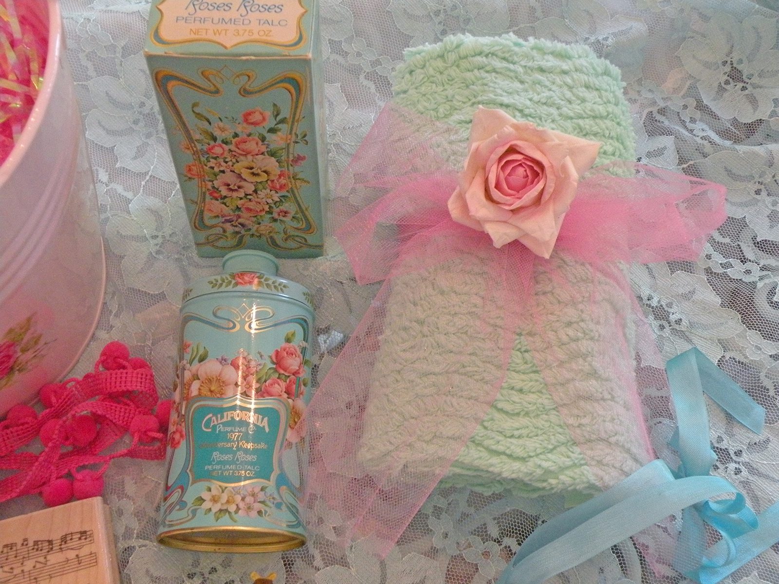 Light mint green chenille and a beautiful vintage avon perfumed talc container.