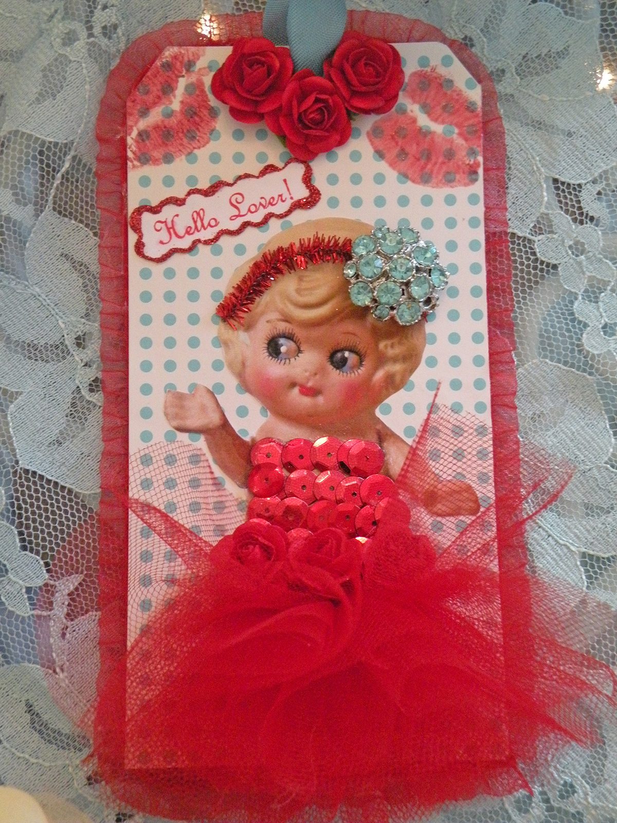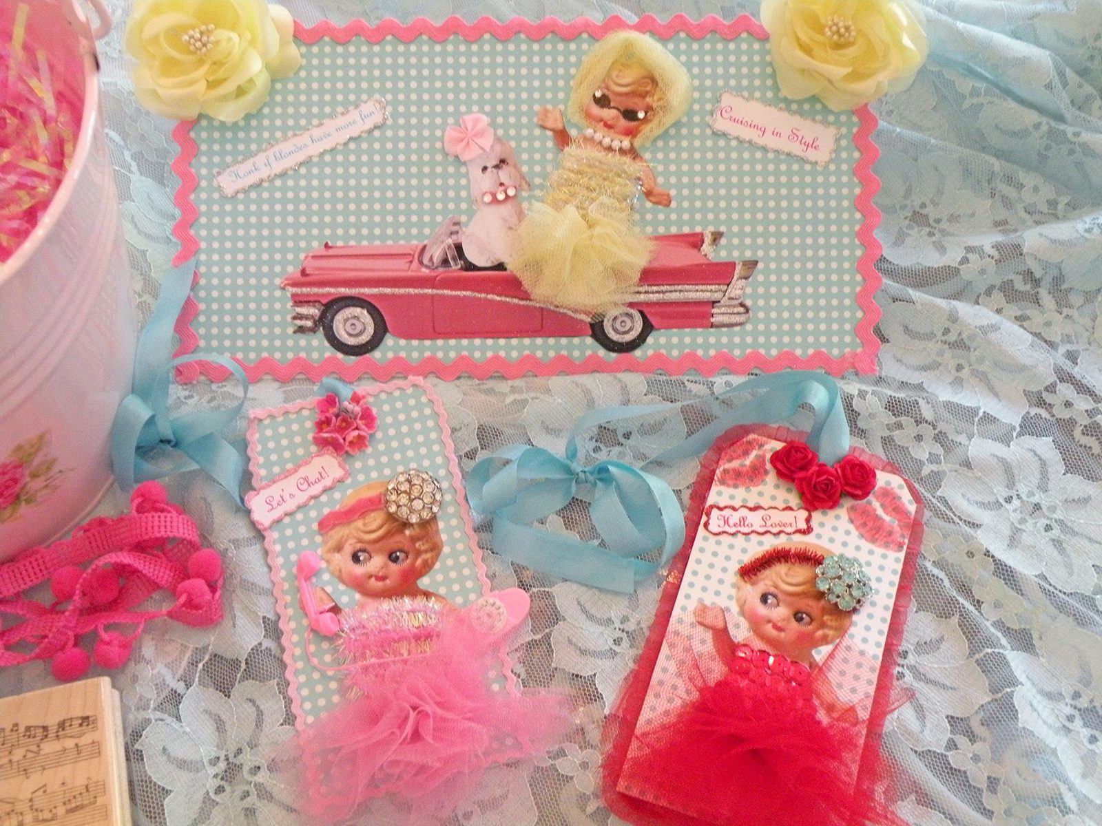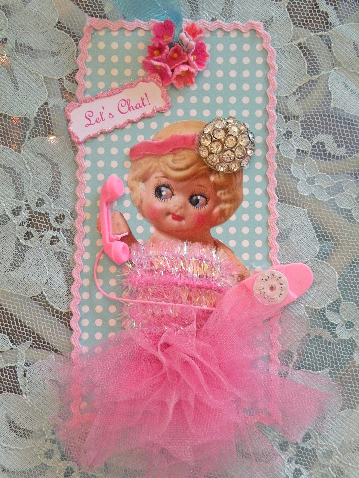 Last but not least. I made these adorable and fun tags. The little doll remindes me of Doris Day (hence the oldies music). Especially with the tag titled "Let's Chat". It reminds me of the movie "Pillow Talk". Anyhoo, these are uber cute and who ever wins my drawing I hope they will find a special place for them. ๐