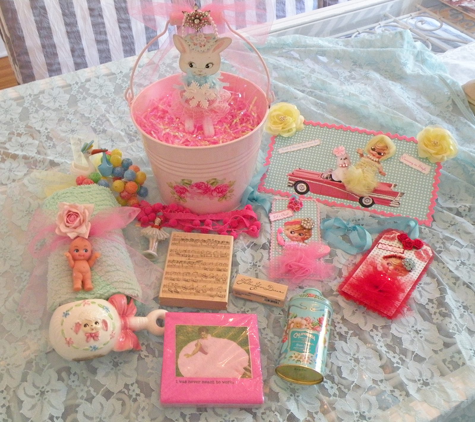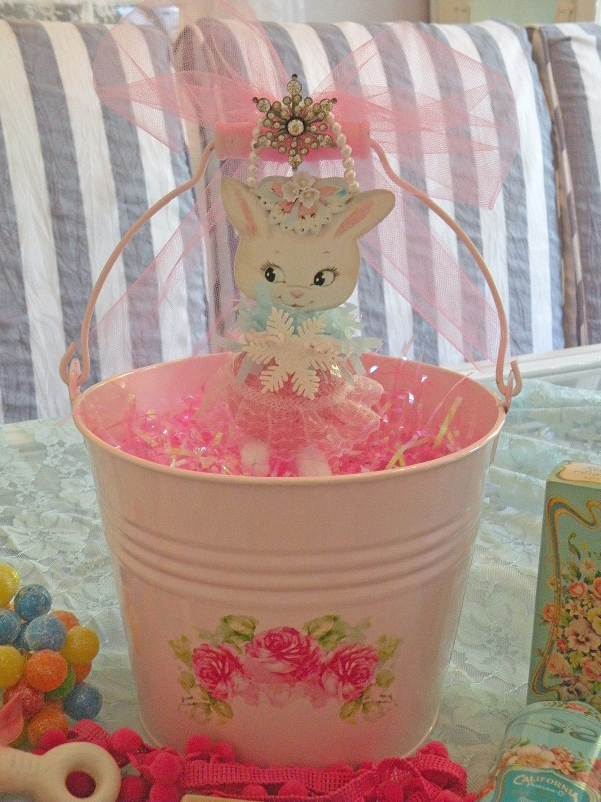 Shabby pink pail and one of my girlie bunny Christmas ornaments (Yes Christmas! hee! hee!)