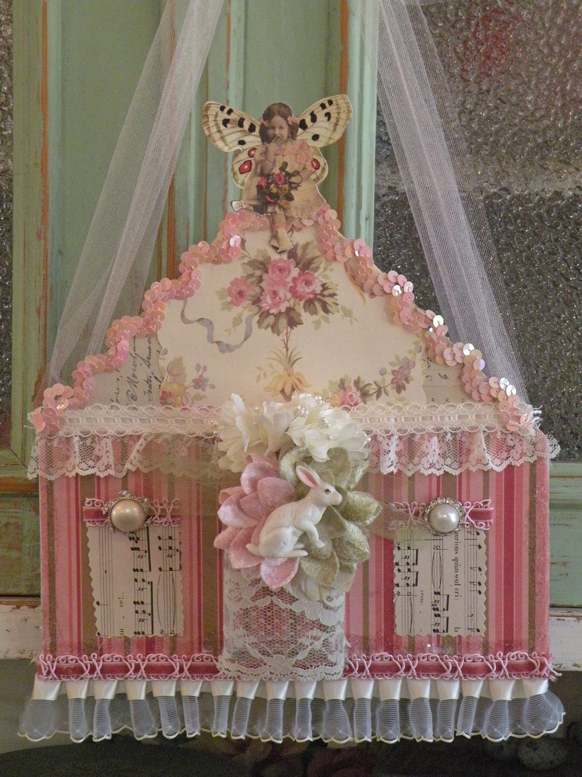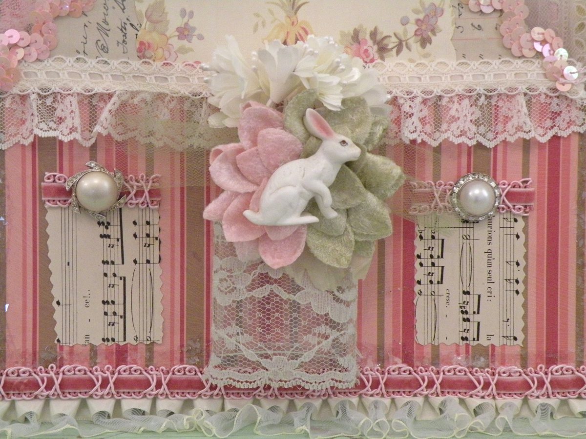 I was thrilled to take a Pam Garrison class for the first time. The class was called "Home for the Holidays". I made this darling little cottage home. What was wonderful about the classes was EVERYONES was completely different from one another. No two were alike. Everyone put their own personal style and touches into their pieces. This is my darling little cottage house I created. The glass bottle with the flower and bunny attached is to hold flowers.