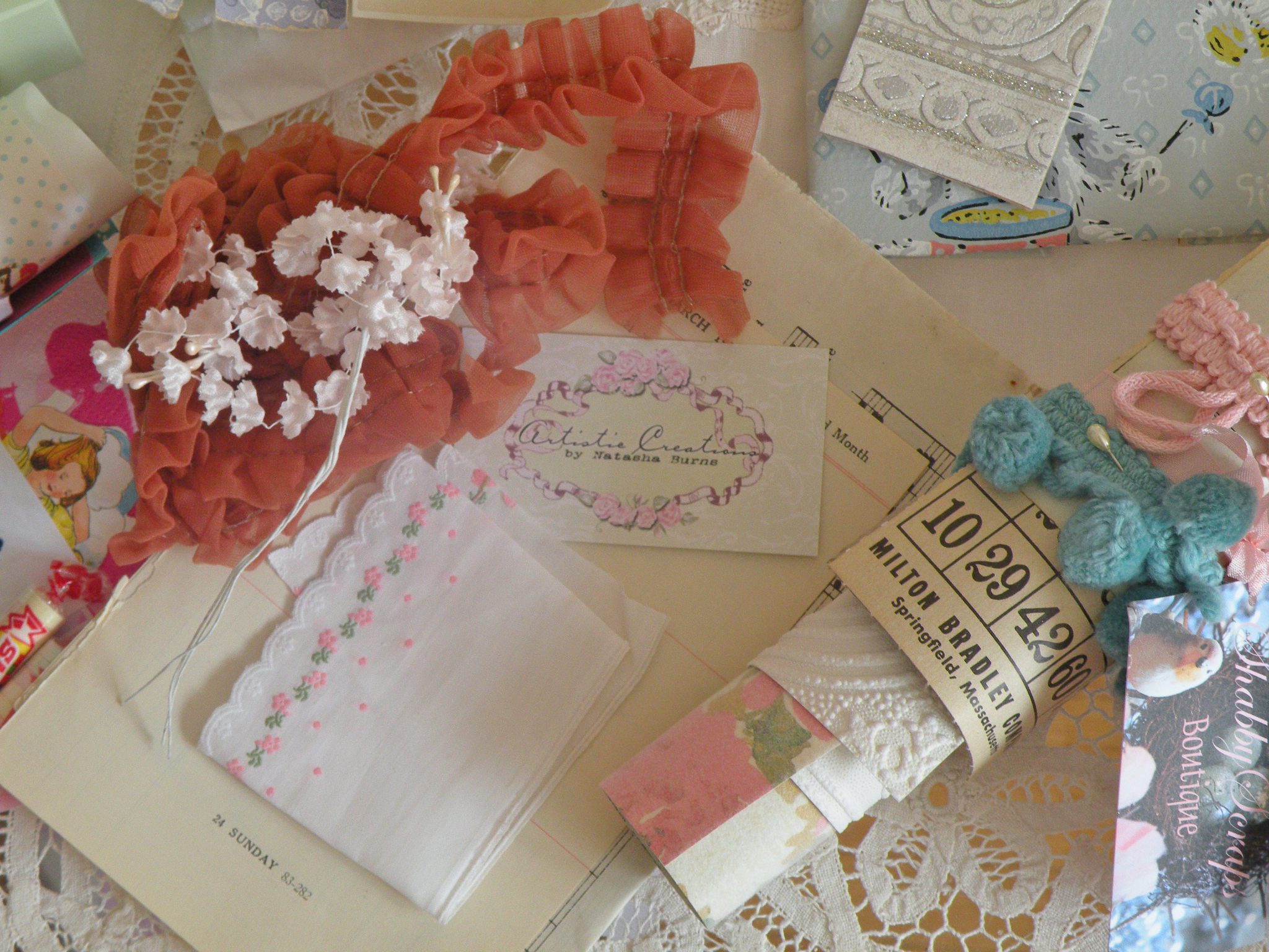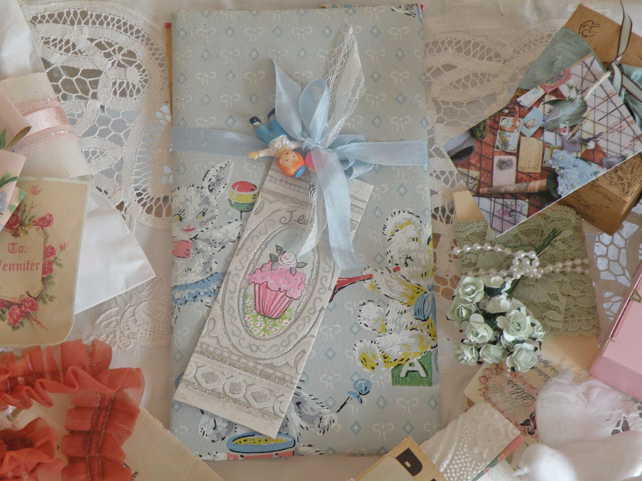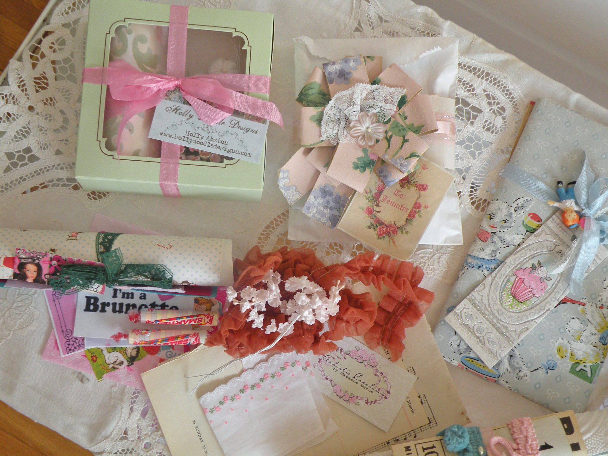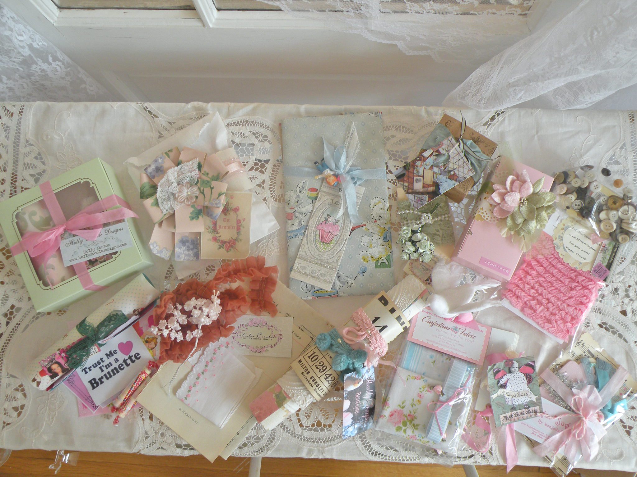 Inside these sweet little packages are the most precious lovelies of ribbon, lace,wallpaper,buttons,millinery,pretty papers,velvet, and yummy bath salts!