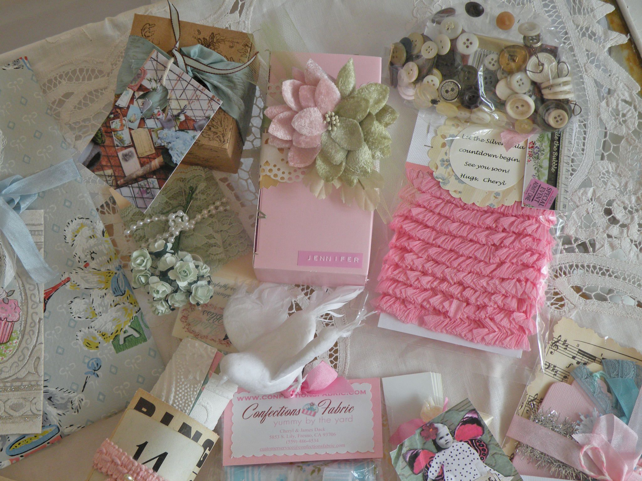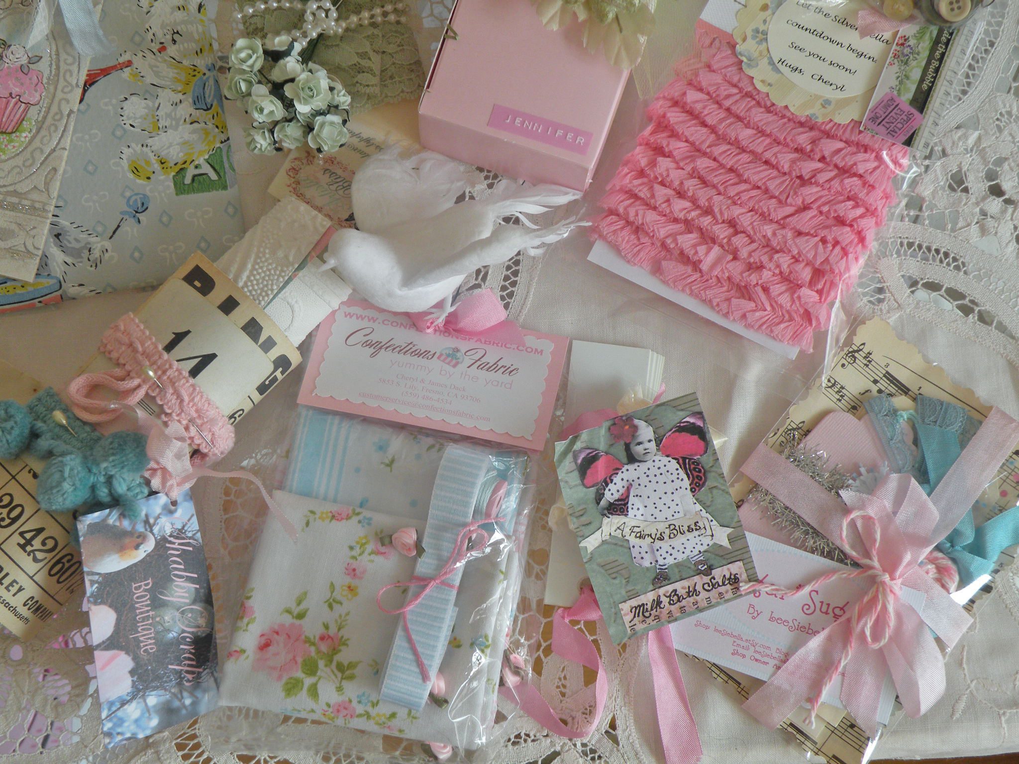 Amongst all this busyness I made a little time for a Pre Silver Bella swap hosted by the lovely Miss Karla of Karla's Cottage. What a FABULOUS group of gals to swap with! The ladies were Jessi, Kim,Holly,Heather,Natasha,Analise,Cheryl,Carol,Tiffany,Andrea,Cheryl, and ME! We decided to swap pretty materials to use for our projects and creations.
