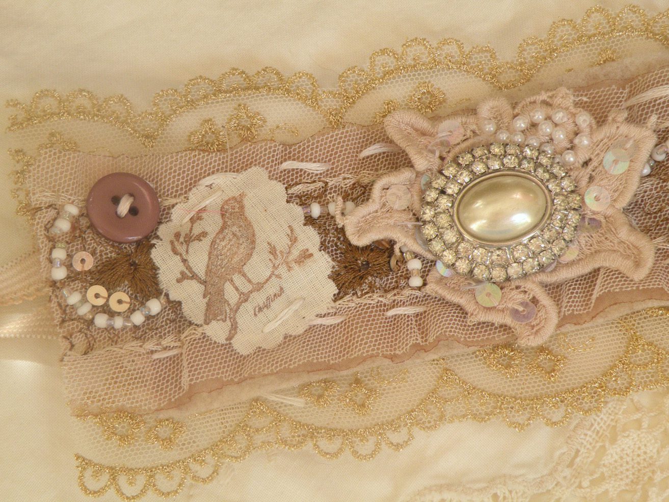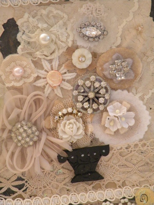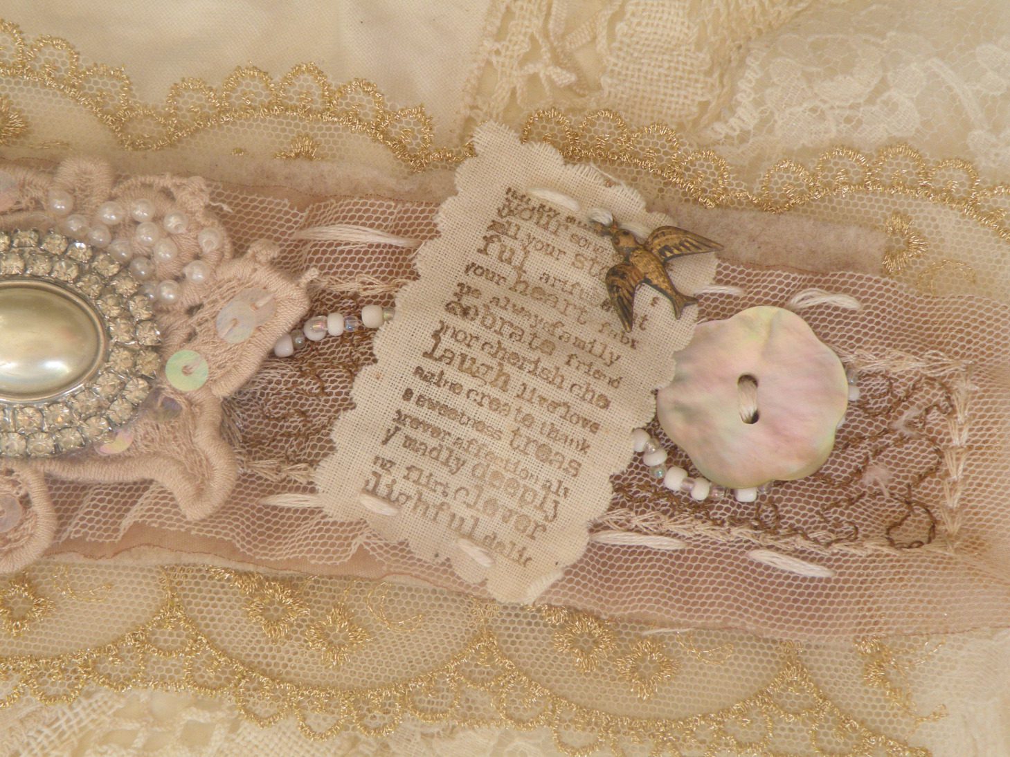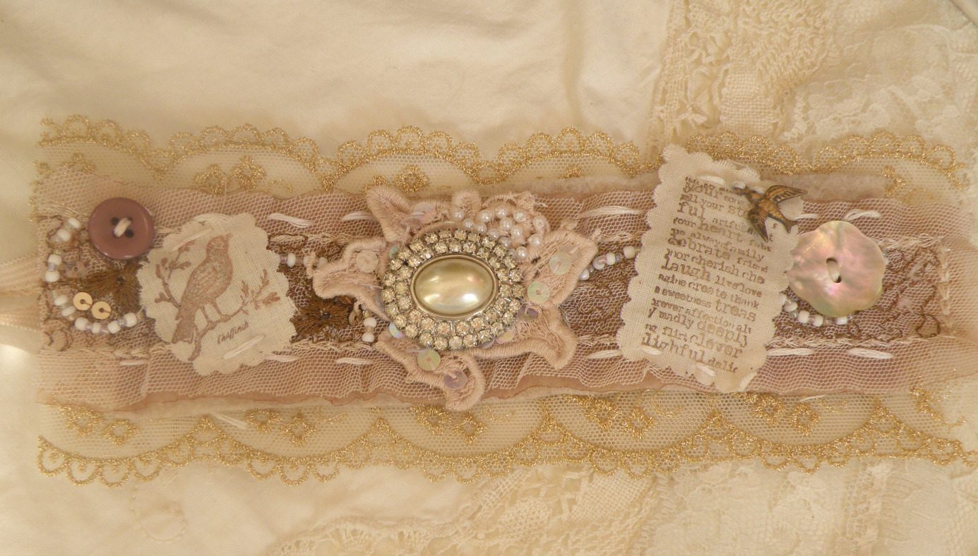 Im really thrilled with how my collage turned out. It will look lovely in my ivory living room. The last class of the day was romantic wristlets taught by Ruth Rae. Im very challenged by sewing, but I gave it my best and Im actully pretty happy with how my wristlet turned out.