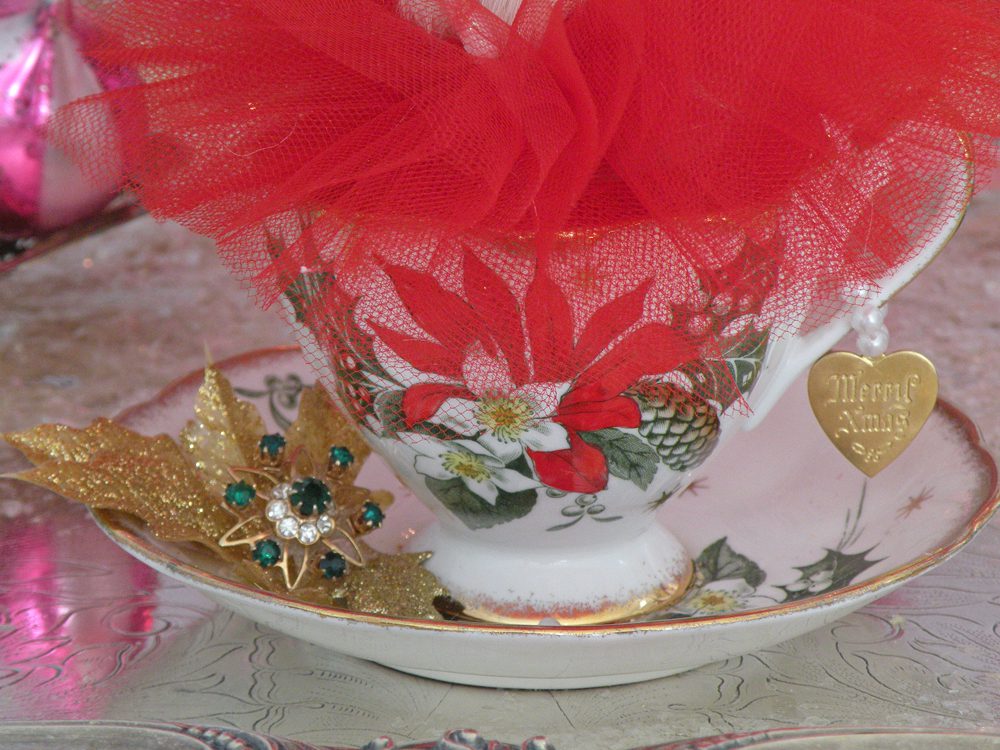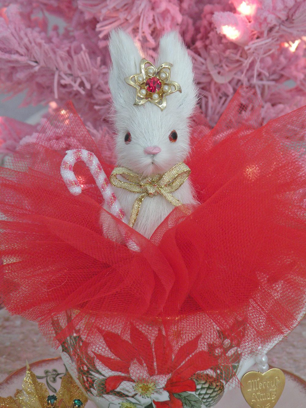 This bright red cheery little bunny you see is Penelope Ponisettia. She is sitting sweet and pretty in her vintage little tea cup. Here is some close up details of Miss Penelope.