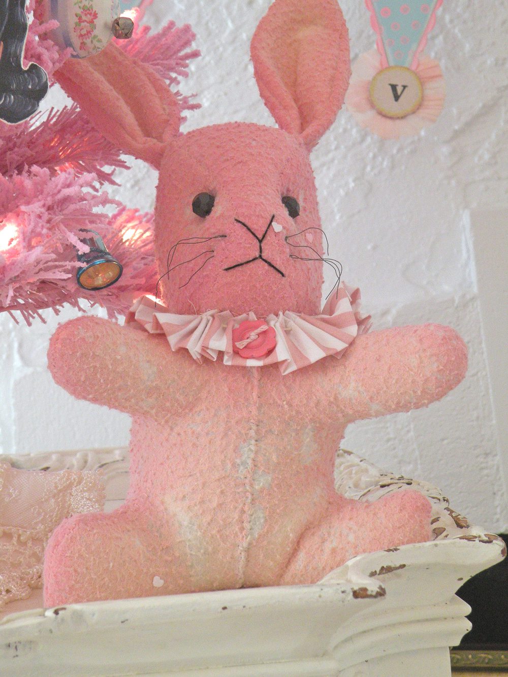 Now let me tell you. When the package arrived I was expecting SMALL. Right? It's only two small ornaments. Well, the package was a wee bit bigger than expected. Tucked inside and wrapped in tissue paper was Jenny's pink bunny that she blogged about a year ago. My heart stopped! I had commented on how much I *loved* and *adored* this bunny. I know Jenny is a lover and collector of bunnies like I am. So you can understand how shocked I was that she sent him to come live with us. "Yes, I said him." Jenny referes to him as a male. ;) So now we have adopted and are the proud parents of Mr. Pinky. That is the name me and the children have decided to call him. Thank you sooo much Jenny for this unbelievably SWEET surprise. We will take excellent care of him!!!!