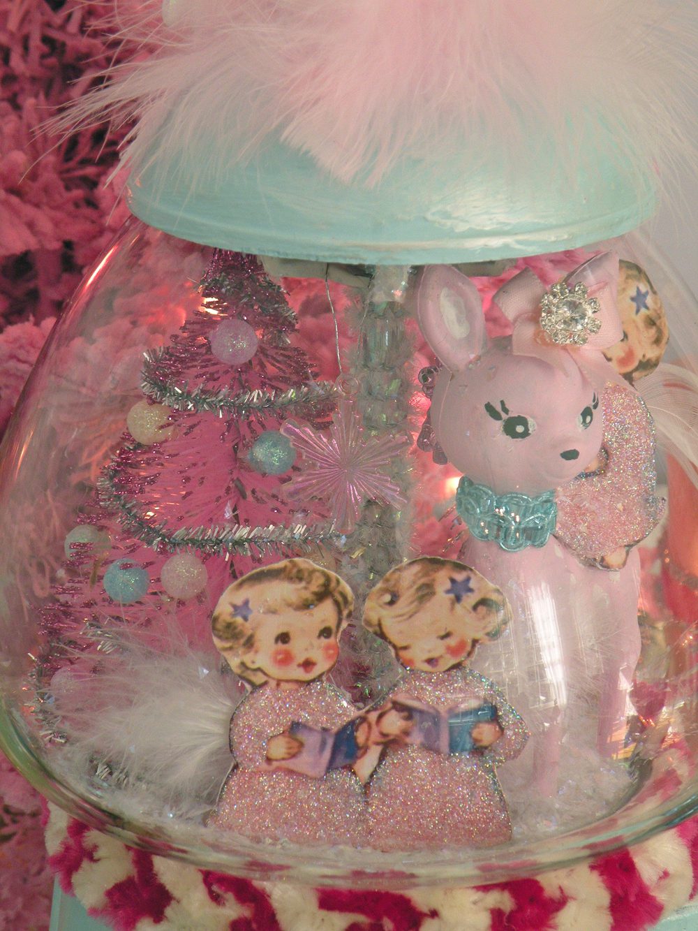 This next oooh so darling winter snowglobe is titled "We three angels" and is one that will give you a sugar rush!!!! Pink and Aqua, pink reindeer, and little singing angels. *SIGH*… can get it get any sweeter???