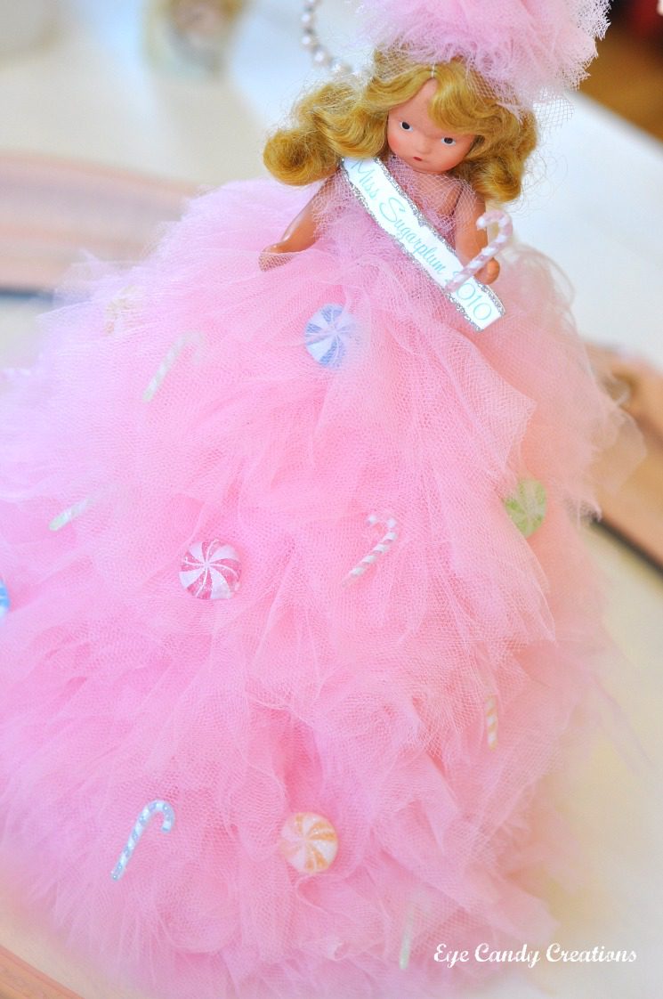 Soft pink tulle and mini sugary sweets adorn her sweet Christmas dress.