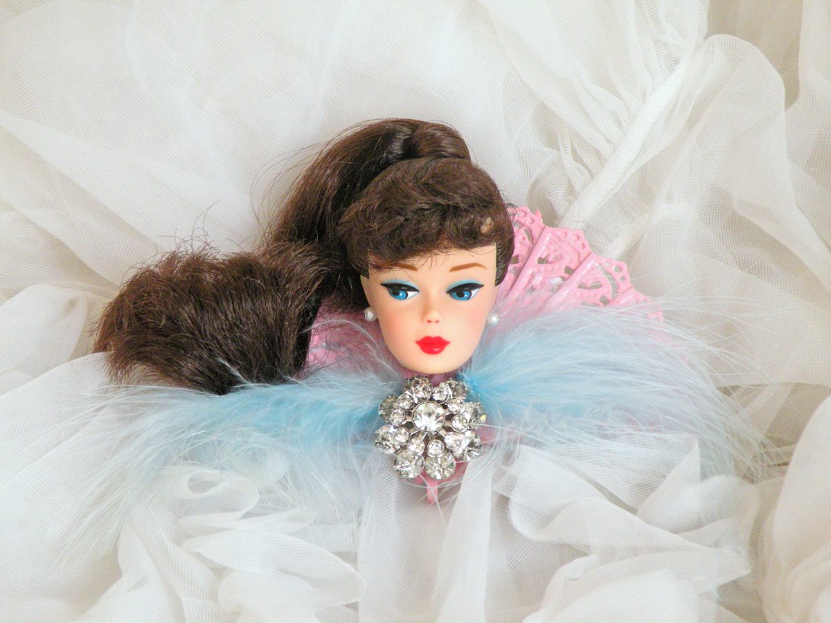 Many of you all know my BIG sis Jessi Nagy. She is the QUEEN Barbie lover! I couldn't resist making her a custom retro Barbie doll brooch. She is always surprising me with gifts so we've kinda started our own CONSTANT swap. Dont you love how the za~za marabou feather matches her blue eyeshadow. hee! hee!