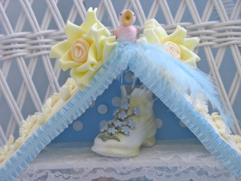 Under the roof is a yellow porcelain baby bootie with blue forget-me-knots. On top the little birdie sings it’s little heart out. ๐