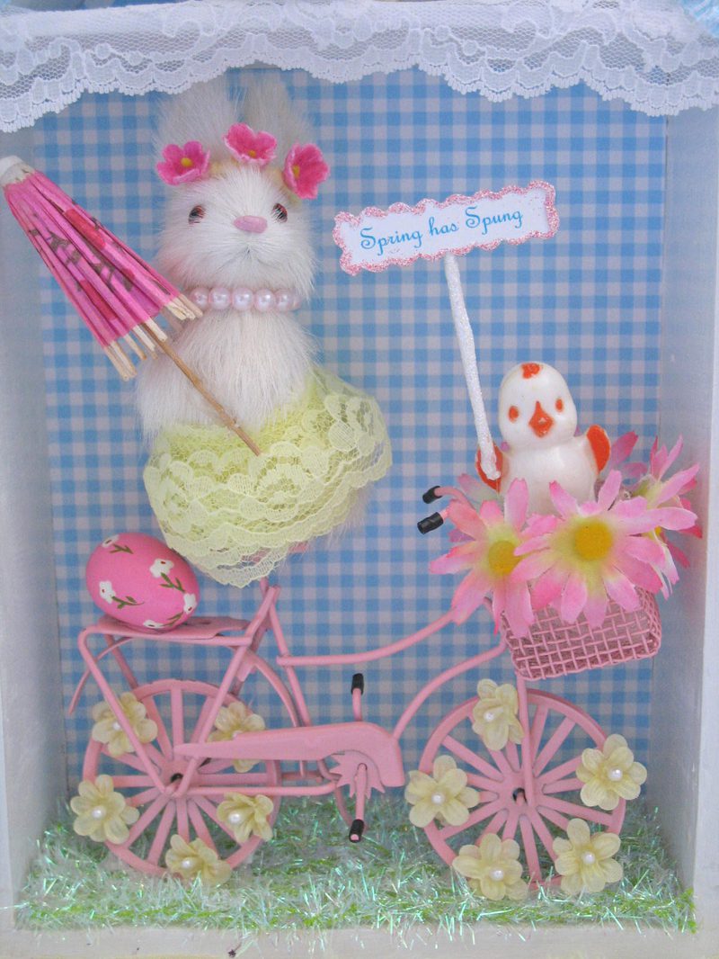 I opted not to make a large shadowbox for Easter this year. Instead, I created two small fun and whimsy mini bunny shadowboxes. This one is titled "Sring has Sprung!" It’s decorated in sunny yellow, pink, and blue.