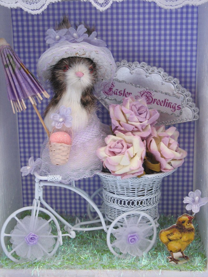 eeeeeek!!! OMG!!! your easter creations are SO SO SO adorable!!! those little bicycles are just about killin me with the cuteness:) and i love Love LOVE the pink basket o’ sweetness!!! i really really love the lavender shadowbox too!!! you have really and truly out~done yourself with these darling creations Miss Jenn!!! i will be watching for these:)