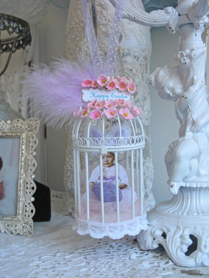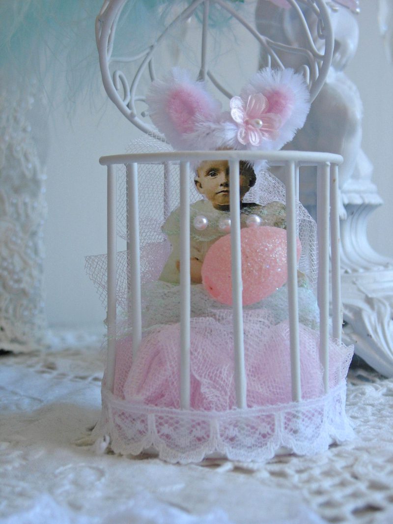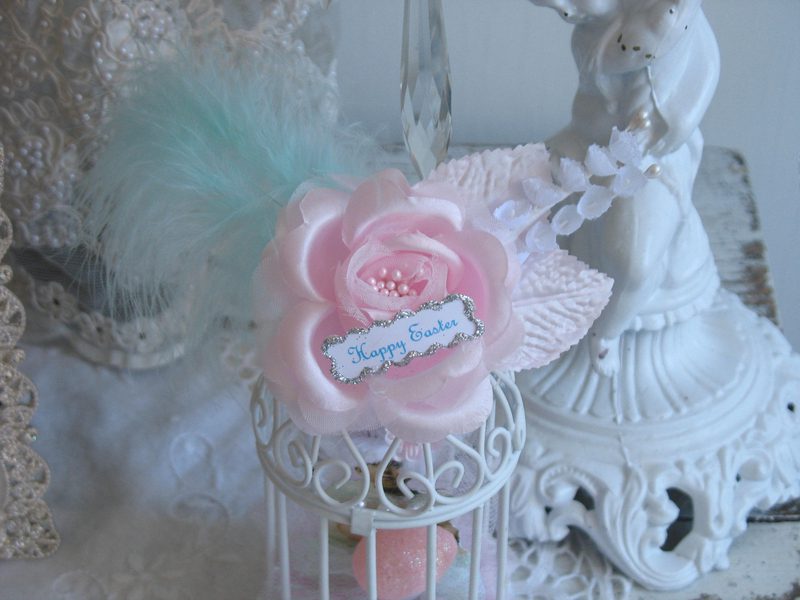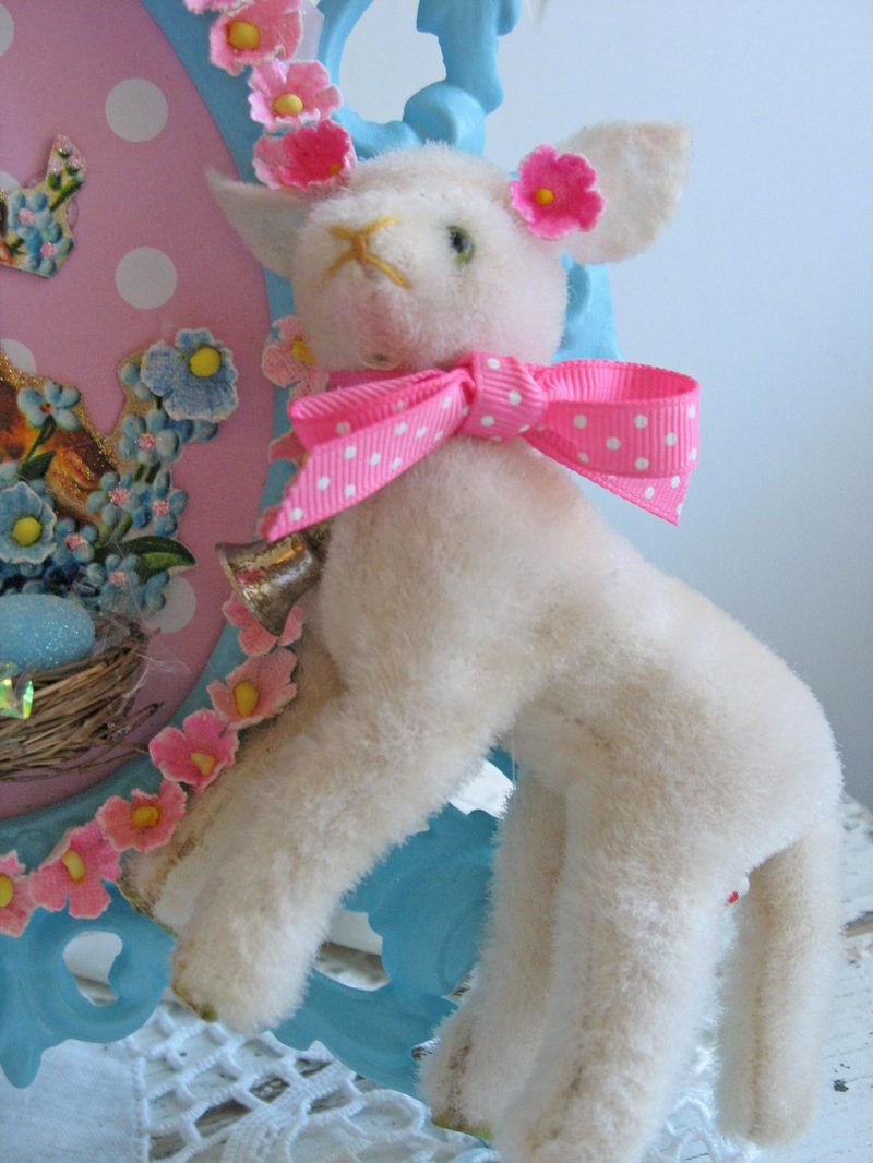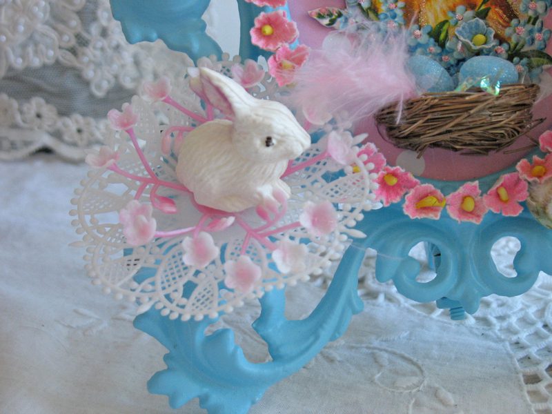 Last but not least, I really loved how this last piece turned out. This picture frame I have had FOREVER. It was sitting in a box painted white, and I held onto it not sure what to do with it. Than, it came to me. Paint it aqua blue and make a darling vintage Easter assemblage. The stuffed lamb I bought on an INCREDIBLE site that I shop frequently called Ruby Lane. The bunny is a vintage pick that I purchased on Ebay. I also adorned it with vintage pink earrings, and lots of pink millinery.