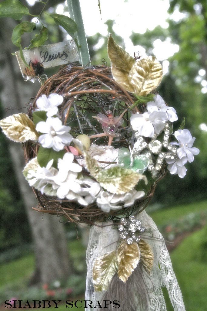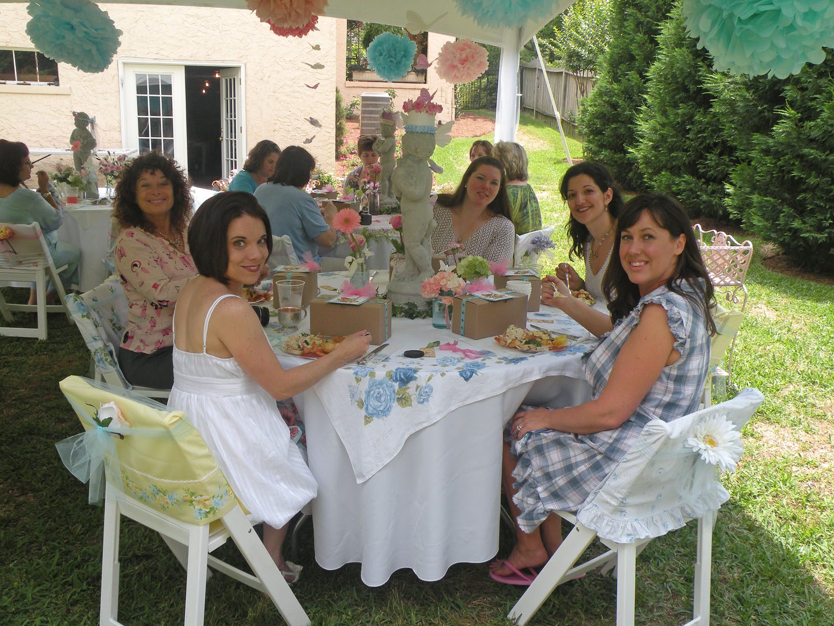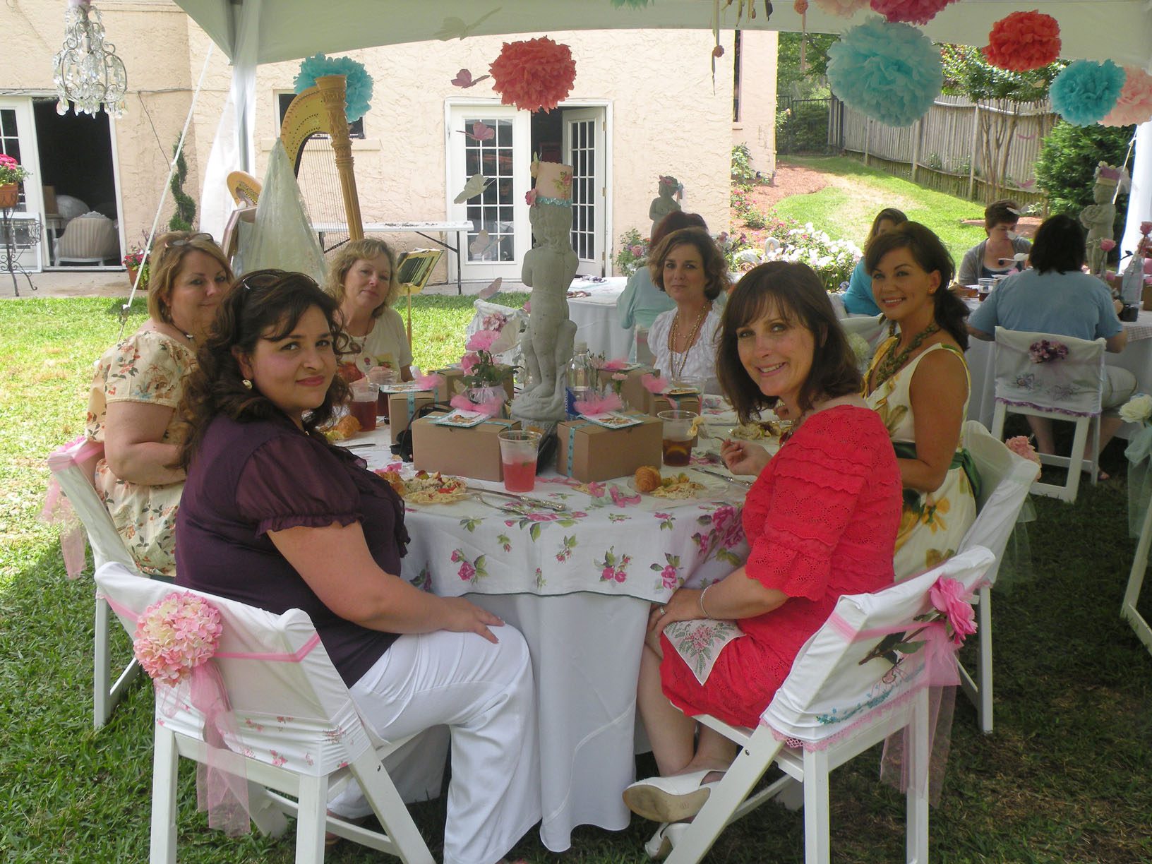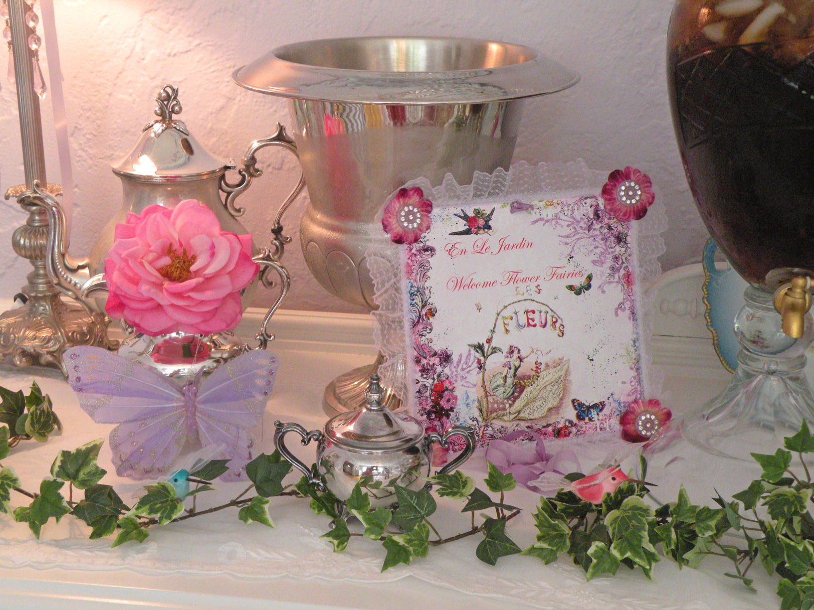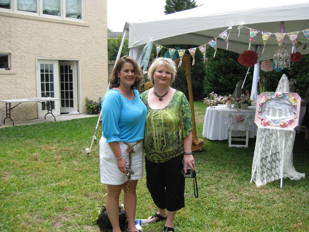 Yummmm!!!!!Cheryl welcomed us girls with open arms and was such a sweetheart to chat with. Goodbye beautiful Savannah!!!! It was a fun ride home. Almost a little too fun to show photos. Let’s just say we were on a sugar cupcake high. 😉 Saturday was the MAIN EVENT!!!! Early noon I hosted a tea luncheon. My Mother and I prepared all the food, and I closed off my dining room to all of the ladies, because I wanted it to be a surprise. I spent much time decorating and transforming my dining room into a dreamy beautiful enchanted garden “feel” for the luncheon. Me and my darling friend Cheryl. My gorgeous Sis Jessi!Darling beautiful friends.We dined outside under the beautiful decorated tent. For many of you that know my artwork it’s all about the DETAILS!!!! So I went ALL out on the details of the decor. Tables were set with vintage floral linens, vintage hankie napkins, white wedding chairs that I coverd with vintage embroidered pillow cases and tied with tulle and silk flowers, cherub statue centerpieces, and beautiful vintage bottles of fresh flowers that I decorated with lace, ribbon, and glitter butterflies.I decorated this old frame with vintage millinery, butterflies, and glitter banner created by the super sweet and talented Madai of Forget me Nots from Wren Cottage.It was a BIG surprise to the girls, but one of my FAVORITE artist is the super kind and creative talent Kris Hurst . She and her lovely sweet friend Marilyn drove down to Macon to help me set up for my event. Kris is in the works of wanting to plan an art retreat close to her home, so she decided she would like to come and help me out and take some notes. 🙂 I commissioned Kris to make me a banner that says “Welcome Flower Fairies”. EEEK!!! Sooooo adorable!Gifts for the flower fairies. I made them each a flower bottle.Andrea hosted a garden swap for us gals and she stuffed all the incredible treasures inside these big beautiful ruffled tote bags she made for us all. It felt like Christmas opening up all the sweet lovelies inside! It felt like an oasis of beauty surrounding us!!!!!Some cute snapshots of the ladies.Andrea and Lorraine who I now call “Miss Pinky” and who always makes me smile!!!Angela and Sherry.The tiniest flower fairy being such the lady!I had TWO surprises for the ladies. I wanted to my retreat and luncheon to have an elegant feel to it, and thought it would be lovely to have a harpist perform. I hired Calista who is an AMAZINGLY talented!!! Her beautiful soft erethreal music really made the event even more special.My next surprise was something both Natasha and I planned. Since she could not obviously be here to attend, Natsha made a “mini me”. We ALL cracked up!!! She looked so lovely sitting in her chair. 😉 tee! hee! Cheryl and I giving Natasha a sip of champange punch. Not too much tho’….we didnt want her getting too tipsy!After the luncheon we had a little Vendor Fair set up. Tons of sparkley goodies!Silly Analise!Georgia Southern Belles!In the corner of my yard we set up a beautiful outdoor sitting area.Moi. 🙂My incredible birdcage that I just found a few weeks ago.You NEVER know what’s going to happen in this crazzy Georgia weather. Once we got started working on our projects. It proceeded to rain!!!! Thank heavens for the tent. We all huddled about and worked regardless of the short downpour. The rain NEVER once dampened our sprits!!! As you can see Miss Tiffany and Karla thought it would be fun to slide down my childrens slide in the rain. We we ALL laughed hystarically! Such a cutie even when soaking wet!Everyone kept working while it was pouring rain, and we chatted and laughed the whole time. The completed projects ALL turned out sooo beautiful and unique to the artist personality and style!!! Tiffany and Andrea’s gorgeous flower pots.Tiffany’s stunning flower pot filled with flowers.The girls REALLY LOVED making the fairy ball ornaments.Miss Karla’s.Cheryl’s sweet little wee one.Kim’sThis darling little fairy ball has twinkling lights and is made by one of the kindest and sweetest ladies Rosalyn-Sue.Im simply amazed at how everyone’s projects turned out. Im still “pinching” myself that I taught my first class!To end our FABULOUS weekend, we all dried off and rested afterwards, than later on got all “dolled up” for a garden cocktail party hosted by one of my dearest friends Suzanne McCrone. She had a beautiful spread of food and cocktails!Andrea, Tiffany, Suzanne, and Lorraine.Suzanne’s husband Reg really knows how to make a yummy cocktail!Some fun snapshots of the ladies.Such pretty ladies in their floral dresses.After hours of talking, bonding, and laughing so hard that our tummies hurt we finally called it a night at 1am. Sunday rolled around and it was time for the girls to pack up all their pretties and head home. It was sooo bittersweet! I’ve enjoyed spending more quality time with my old friends and bonding and getting to know my new friends. Needless to say I was one EXHAUSTED girl!!! LOL!!!! The weekend could not have been more perfect and more beautiful!!! I felt so inspired and creatively rejuvenated by being surrounded by these super talented women! I can’t thank you ladies enough for attending my first event and making it a HUGE success!!!! I want to end this VERY long post (thanks for hanging in there!) with a painting the uber talented Karla painted that sums up some really funny (inside joke) moments.Pictured is me as Queen Flower Fairy, Tiffany going down the slide, Lorraine sitting pretty in her chair, Carol with a black eye (long story! LOL!), Jessi with her pretty pointed toes, Cheryl standing on top of cupcake, Analise giving homeboy peace signs, and Andrea and Kim showing ABC flashcards. Thank you ladies for the memories…. I will cherish this weekend forever!XOXO,