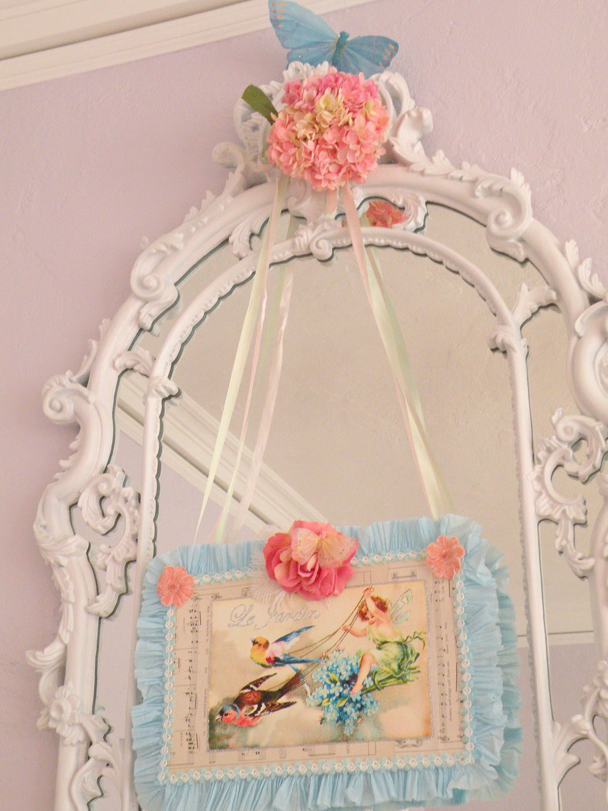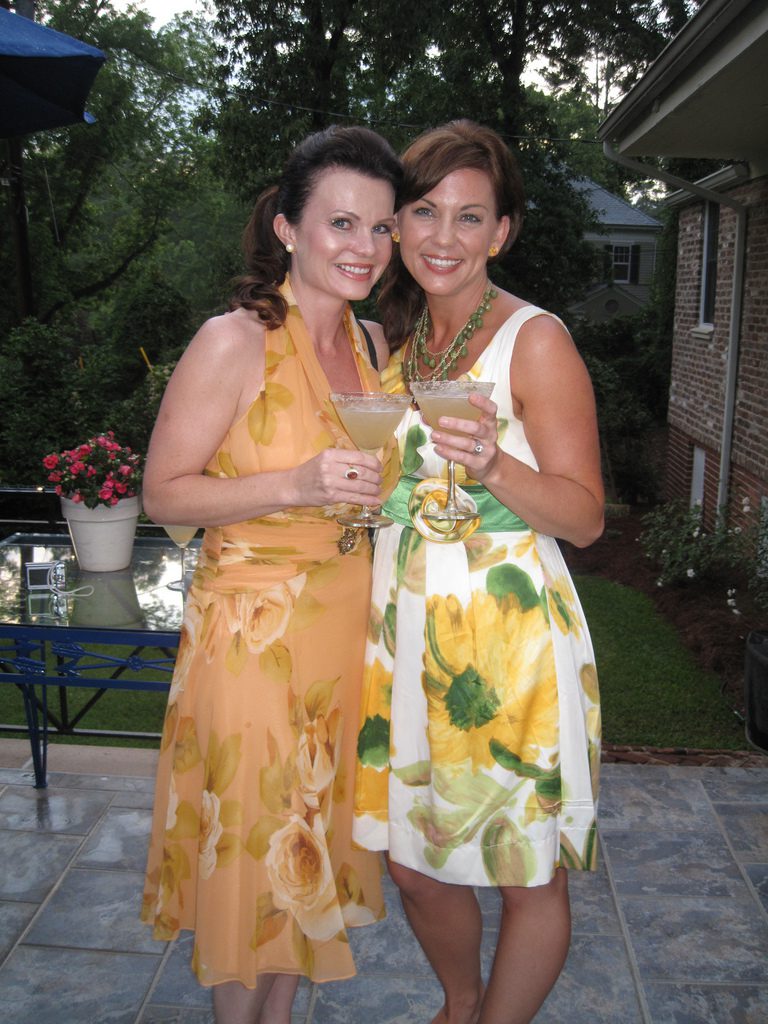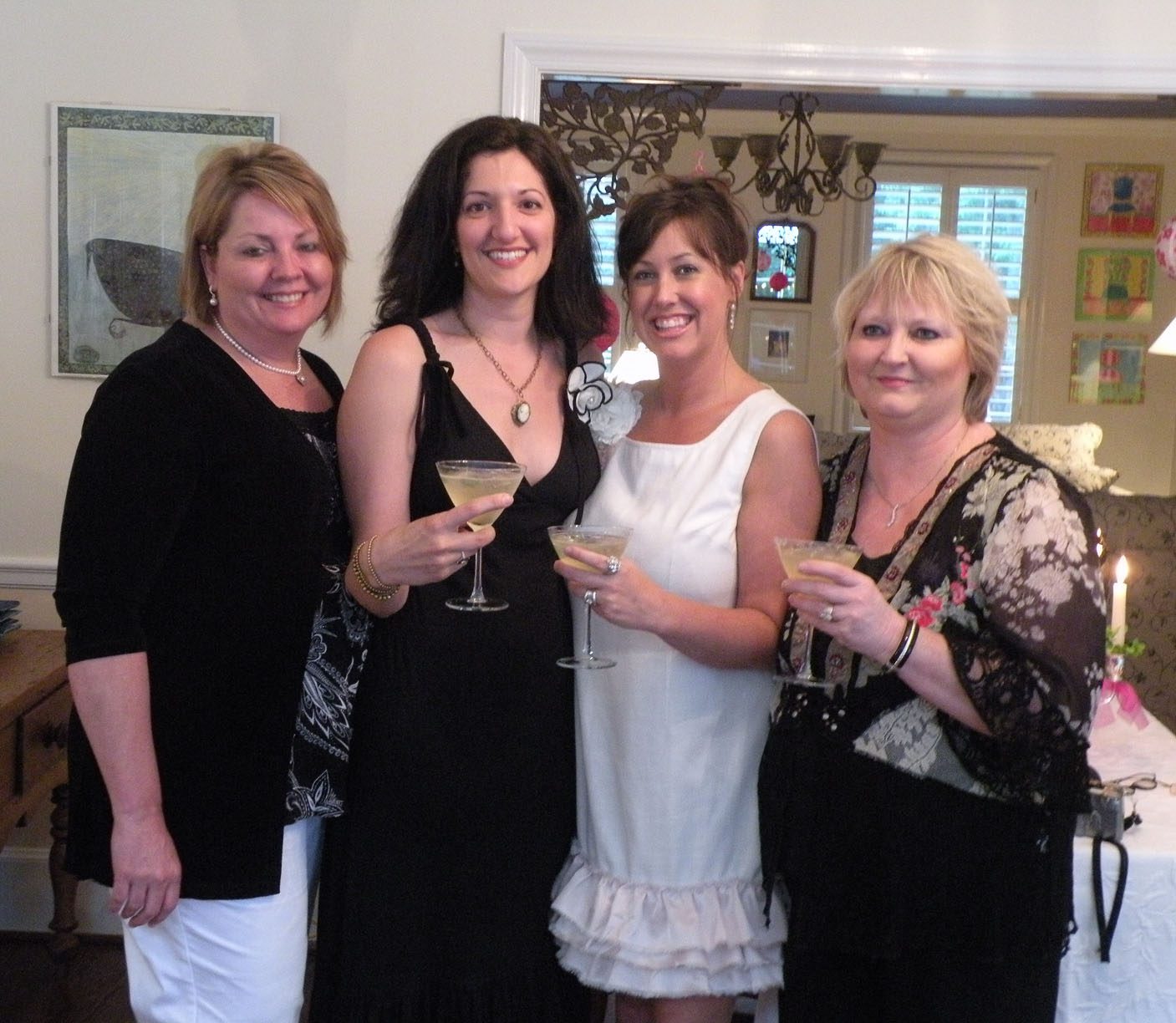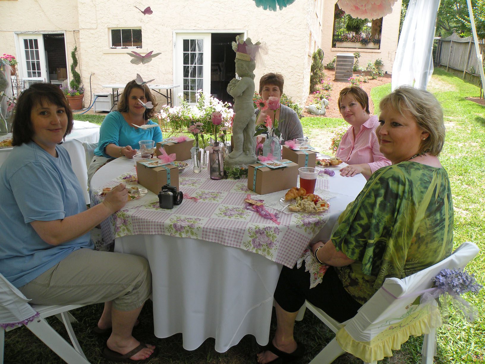 Yummmm!!!!!Cheryl welcomed us girls with open arms and was such a sweetheart to chat with. Goodbye beautiful Savannah!!!! It was a fun ride home. Almost a little too fun to show photos. Let’s just say we were on a sugar cupcake high. 😉 Saturday was the MAIN EVENT!!!! Early noon I hosted a tea luncheon. My Mother and I prepared all the food, and I closed off my dining room to all of the ladies, because I wanted it to be a surprise. I spent much time decorating and transforming my dining room into a dreamy beautiful enchanted garden “feel” for the luncheon. Me and my darling friend Cheryl. My gorgeous Sis Jessi!Darling beautiful friends.We dined outside under the beautiful decorated tent. For many of you that know my artwork it’s all about the DETAILS!!!! So I went ALL out on the details of the decor. Tables were set with vintage floral linens, vintage hankie napkins, white wedding chairs that I coverd with vintage embroidered pillow cases and tied with tulle and silk flowers, cherub statue centerpieces, and beautiful vintage bottles of fresh flowers that I decorated with lace, ribbon, and glitter butterflies.I decorated this old frame with vintage millinery, butterflies, and glitter banner created by the super sweet and talented Madai of Forget me Nots from Wren Cottage.It was a BIG surprise to the girls, but one of my FAVORITE artist is the super kind and creative talent Kris Hurst . She and her lovely sweet friend Marilyn drove down to Macon to help me set up for my event. Kris is in the works of wanting to plan an art retreat close to her home, so she decided she would like to come and help me out and take some notes. 🙂 I commissioned Kris to make me a banner that says “Welcome Flower Fairies”. EEEK!!! Sooooo adorable!Gifts for the flower fairies. I made them each a flower bottle.Andrea hosted a garden swap for us gals and she stuffed all the incredible treasures inside these big beautiful ruffled tote bags she made for us all. It felt like Christmas opening up all the sweet lovelies inside! It felt like an oasis of beauty surrounding us!!!!!Some cute snapshots of the ladies.Andrea and Lorraine who I now call “Miss Pinky” and who always makes me smile!!!Angela and Sherry.The tiniest flower fairy being such the lady!I had TWO surprises for the ladies. I wanted to my retreat and luncheon to have an elegant feel to it, and thought it would be lovely to have a harpist perform. I hired Calista who is an AMAZINGLY talented!!! Her beautiful soft erethreal music really made the event even more special.My next surprise was something both Natasha and I planned. Since she could not obviously be here to attend, Natsha made a “mini me”. We ALL cracked up!!! She looked so lovely sitting in her chair. 😉 tee! hee! Cheryl and I giving Natasha a sip of champange punch. Not too much tho’….we didnt want her getting too tipsy!After the luncheon we had a little Vendor Fair set up. Tons of sparkley goodies!Silly Analise!Georgia Southern Belles!In the corner of my yard we set up a beautiful outdoor sitting area.Moi. 🙂My incredible birdcage that I just found a few weeks ago.You NEVER know what’s going to happen in this crazzy Georgia weather. Once we got started working on our projects. It proceeded to rain!!!! Thank heavens for the tent. We all huddled about and worked regardless of the short downpour. The rain NEVER once dampened our sprits!!! As you can see Miss Tiffany and Karla thought it would be fun to slide down my childrens slide in the rain. We we ALL laughed hystarically! Such a cutie even when soaking wet!Everyone kept working while it was pouring rain, and we chatted and laughed the whole time. The completed projects ALL turned out sooo beautiful and unique to the artist personality and style!!! Tiffany and Andrea’s gorgeous flower pots.Tiffany’s stunning flower pot filled with flowers.The girls REALLY LOVED making the fairy ball ornaments.Miss Karla’s.Cheryl’s sweet little wee one.Kim’sThis darling little fairy ball has twinkling lights and is made by one of the kindest and sweetest ladies Rosalyn-Sue.Im simply amazed at how everyone’s projects turned out. Im still “pinching” myself that I taught my first class!To end our FABULOUS weekend, we all dried off and rested afterwards, than later on got all “dolled up” for a garden cocktail party hosted by one of my dearest friends Suzanne McCrone. She had a beautiful spread of food and cocktails!Andrea, Tiffany, Suzanne, and Lorraine.Suzanne’s husband Reg really knows how to make a yummy cocktail!Some fun snapshots of the ladies.Such pretty ladies in their floral dresses.After hours of talking, bonding, and laughing so hard that our tummies hurt we finally called it a night at 1am. Sunday rolled around and it was time for the girls to pack up all their pretties and head home. It was sooo bittersweet! I’ve enjoyed spending more quality time with my old friends and bonding and getting to know my new friends. Needless to say I was one EXHAUSTED girl!!! LOL!!!! The weekend could not have been more perfect and more beautiful!!! I felt so inspired and creatively rejuvenated by being surrounded by these super talented women! I can’t thank you ladies enough for attending my first event and making it a HUGE success!!!! I want to end this VERY long post (thanks for hanging in there!) with a painting the uber talented Karla painted that sums up some really funny (inside joke) moments.Pictured is me as Queen Flower Fairy, Tiffany going down the slide, Lorraine sitting pretty in her chair, Carol with a black eye (long story! LOL!), Jessi with her pretty pointed toes, Cheryl standing on top of cupcake, Analise giving homeboy peace signs, and Andrea and Kim showing ABC flashcards. Thank you ladies for the memories…. I will cherish this weekend forever!XOXO,
