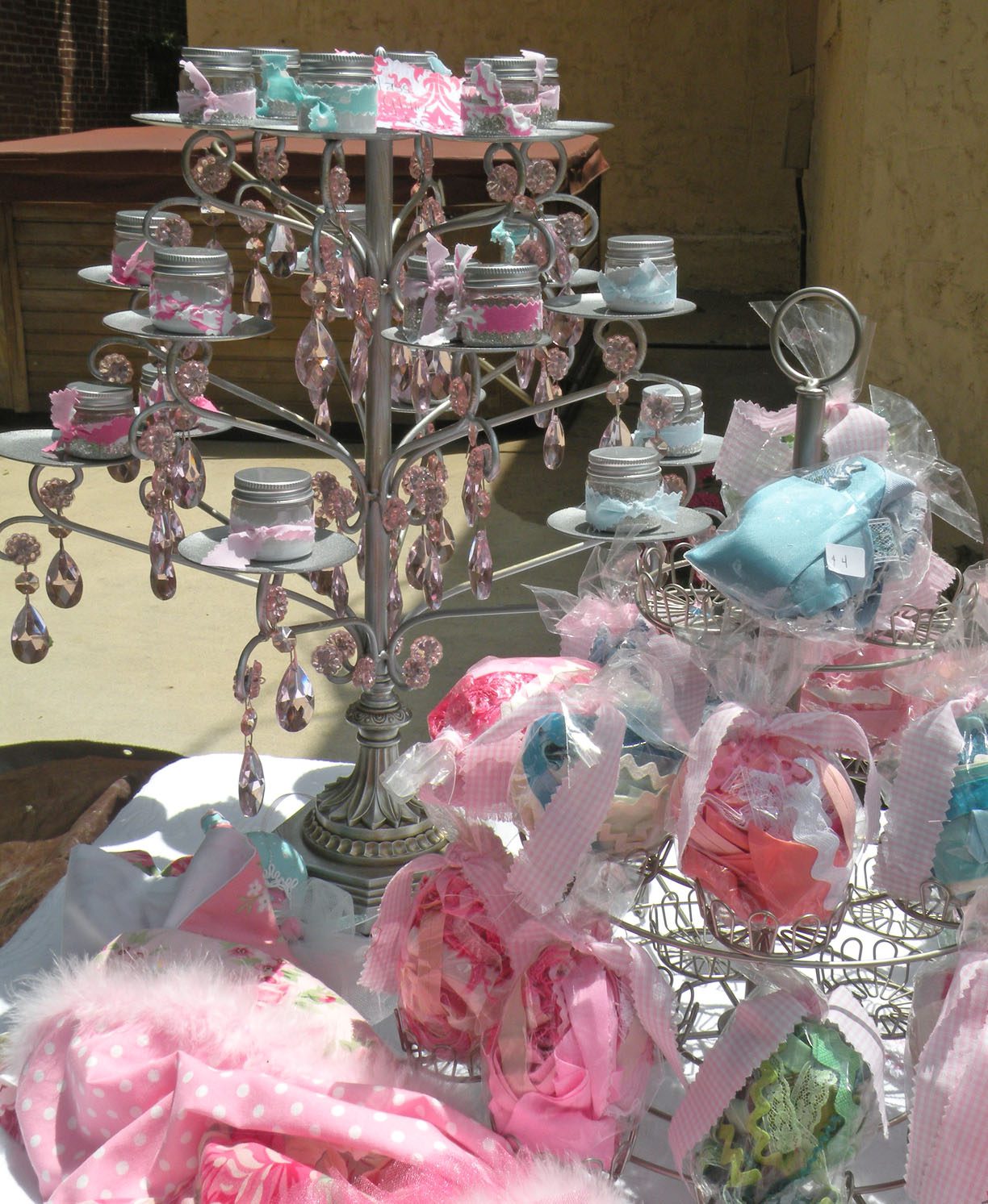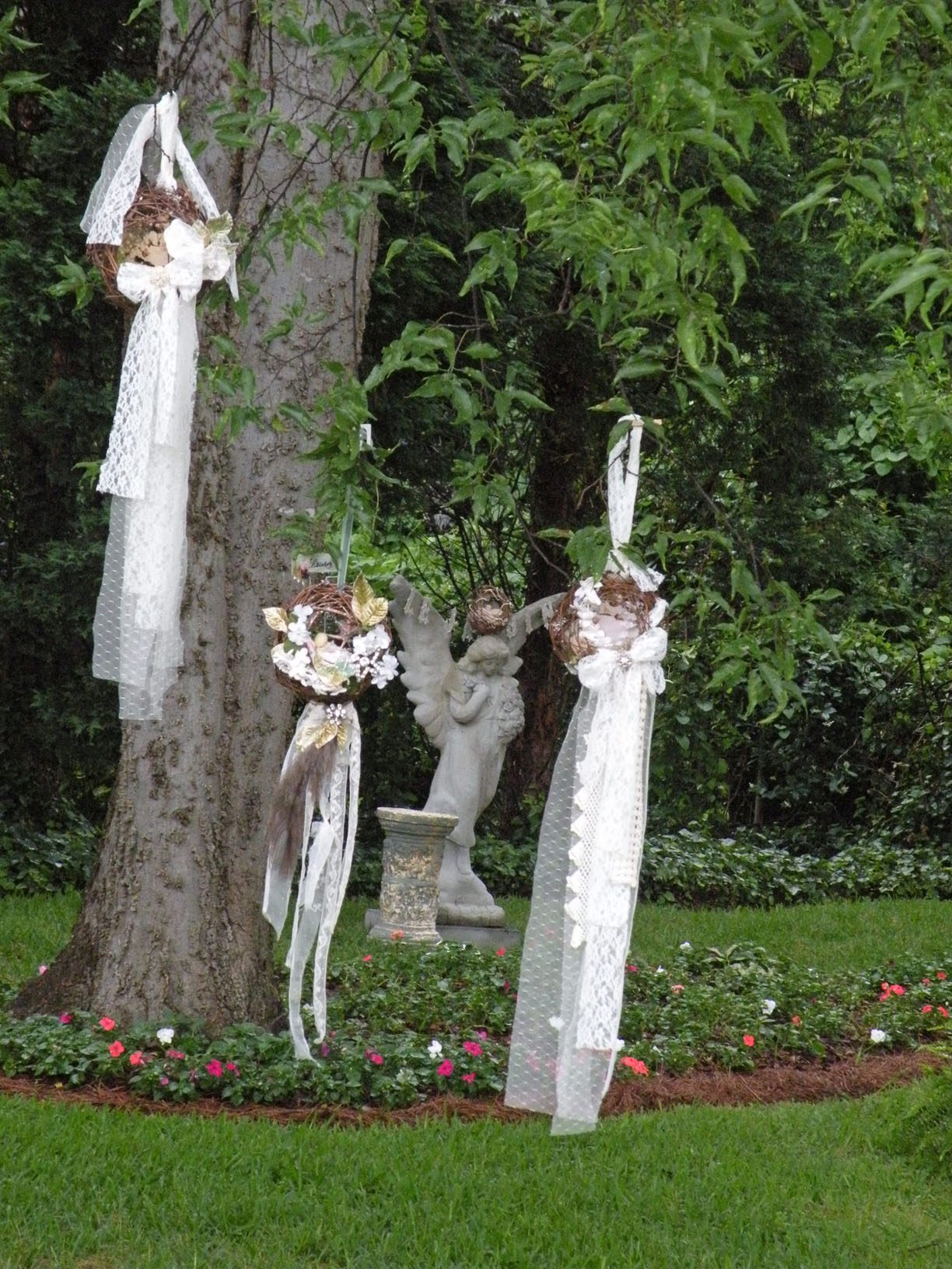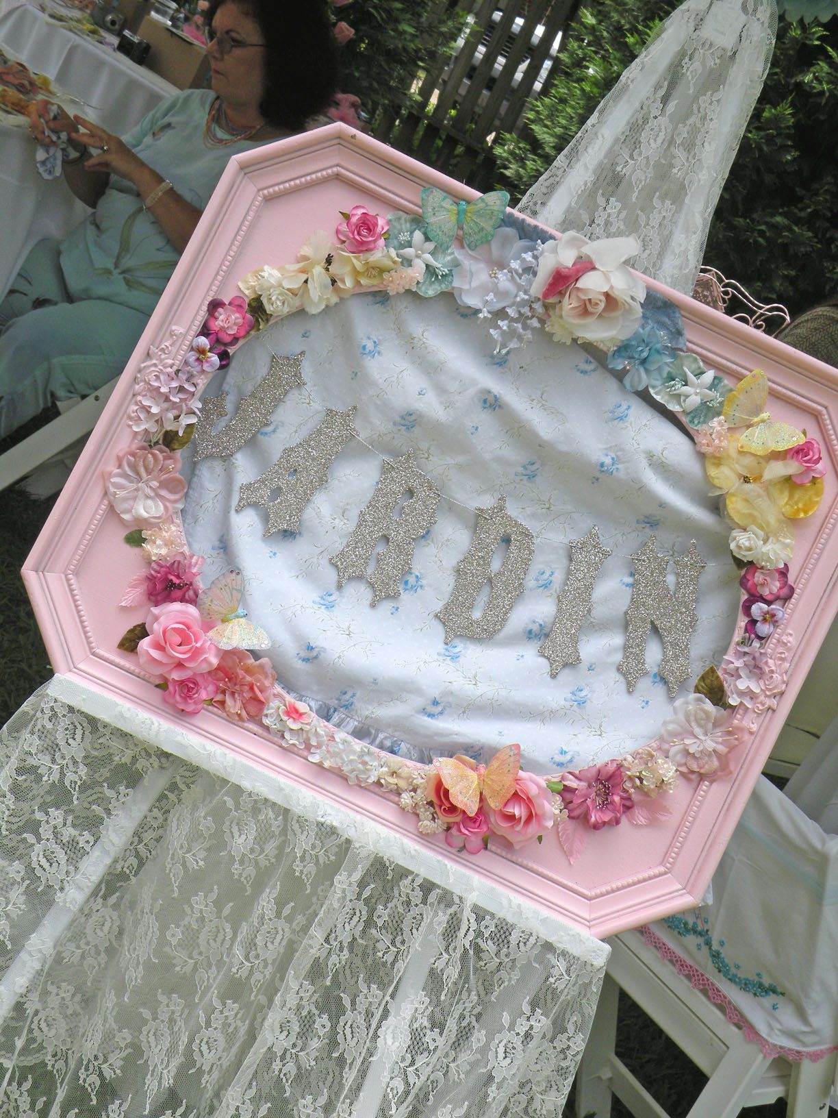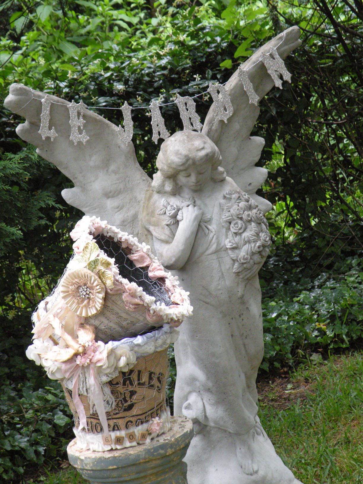 Yummmm!!!!!Cheryl welcomed us girls with open arms and was such a sweetheart to chat with. Goodbye beautiful Savannah!!!! It was a fun ride home. Almost a little too fun to show photos. Let’s just say we were on a sugar cupcake high. 😉 Saturday was the MAIN EVENT!!!! Early noon I hosted a tea luncheon. My Mother and I prepared all the food, and I closed off my dining room to all of the ladies, because I wanted it to be a surprise. I spent much time decorating and transforming my dining room into a dreamy beautiful enchanted garden “feel” for the luncheon. Me and my darling friend Cheryl. My gorgeous Sis Jessi!Darling beautiful friends.We dined outside under the beautiful decorated tent. For many of you that know my artwork it’s all about the DETAILS!!!! So I went ALL out on the details of the decor. Tables were set with vintage floral linens, vintage hankie napkins, white wedding chairs that I coverd with vintage embroidered pillow cases and tied with tulle and silk flowers, cherub statue centerpieces, and beautiful vintage bottles of fresh flowers that I decorated with lace, ribbon, and glitter butterflies.I decorated this old frame with vintage millinery, butterflies, and glitter banner created by the super sweet and talented Madai of Forget me Nots from Wren Cottage.It was a BIG surprise to the girls, but one of my FAVORITE artist is the super kind and creative talent Kris Hurst . She and her lovely sweet friend Marilyn drove down to Macon to help me set up for my event. Kris is in the works of wanting to plan an art retreat close to her home, so she decided she would like to come and help me out and take some notes. 🙂 I commissioned Kris to make me a banner that says “Welcome Flower Fairies”. EEEK!!! Sooooo adorable!Gifts for the flower fairies. I made them each a flower bottle.Andrea hosted a garden swap for us gals and she stuffed all the incredible treasures inside these big beautiful ruffled tote bags she made for us all. It felt like Christmas opening up all the sweet lovelies inside! It felt like an oasis of beauty surrounding us!!!!!Some cute snapshots of the ladies.Andrea and Lorraine who I now call “Miss Pinky” and who always makes me smile!!!Angela and Sherry.The tiniest flower fairy being such the lady!I had TWO surprises for the ladies. I wanted to my retreat and luncheon to have an elegant feel to it, and thought it would be lovely to have a harpist perform. I hired Calista who is an AMAZINGLY talented!!! Her beautiful soft erethreal music really made the event even more special.My next surprise was something both Natasha and I planned. Since she could not obviously be here to attend, Natsha made a “mini me”. We ALL cracked up!!! She looked so lovely sitting in her chair. 😉 tee! hee! Cheryl and I giving Natasha a sip of champange punch. Not too much tho’….we didnt want her getting too tipsy!After the luncheon we had a little Vendor Fair set up. Tons of sparkley goodies!Silly Analise!Georgia Southern Belles!In the corner of my yard we set up a beautiful outdoor sitting area.Moi. 🙂My incredible birdcage that I just found a few weeks ago.You NEVER know what’s going to happen in this crazzy Georgia weather. Once we got started working on our projects. It proceeded to rain!!!! Thank heavens for the tent. We all huddled about and worked regardless of the short downpour. The rain NEVER once dampened our sprits!!! As you can see Miss Tiffany and Karla thought it would be fun to slide down my childrens slide in the rain. We we ALL laughed hystarically! Such a cutie even when soaking wet!Everyone kept working while it was pouring rain, and we chatted and laughed the whole time. The completed projects ALL turned out sooo beautiful and unique to the artist personality and style!!! Tiffany and Andrea’s gorgeous flower pots.Tiffany’s stunning flower pot filled with flowers.The girls REALLY LOVED making the fairy ball ornaments.Miss Karla’s.Cheryl’s sweet little wee one.Kim’sThis darling little fairy ball has twinkling lights and is made by one of the kindest and sweetest ladies Rosalyn-Sue.Im simply amazed at how everyone’s projects turned out. Im still “pinching” myself that I taught my first class!To end our FABULOUS weekend, we all dried off and rested afterwards, than later on got all “dolled up” for a garden cocktail party hosted by one of my dearest friends Suzanne McCrone. She had a beautiful spread of food and cocktails!Andrea, Tiffany, Suzanne, and Lorraine.Suzanne’s husband Reg really knows how to make a yummy cocktail!Some fun snapshots of the ladies.Such pretty ladies in their floral dresses.After hours of talking, bonding, and laughing so hard that our tummies hurt we finally called it a night at 1am. Sunday rolled around and it was time for the girls to pack up all their pretties and head home. It was sooo bittersweet! I’ve enjoyed spending more quality time with my old friends and bonding and getting to know my new friends. Needless to say I was one EXHAUSTED girl!!! LOL!!!! The weekend could not have been more perfect and more beautiful!!! I felt so inspired and creatively rejuvenated by being surrounded by these super talented women! I can’t thank you ladies enough for attending my first event and making it a HUGE success!!!! I want to end this VERY long post (thanks for hanging in there!) with a painting the uber talented Karla painted that sums up some really funny (inside joke) moments.Pictured is me as Queen Flower Fairy, Tiffany going down the slide, Lorraine sitting pretty in her chair, Carol with a black eye (long story! LOL!), Jessi with her pretty pointed toes, Cheryl standing on top of cupcake, Analise giving homeboy peace signs, and Andrea and Kim showing ABC flashcards. Thank you ladies for the memories…. I will cherish this weekend forever!XOXO,