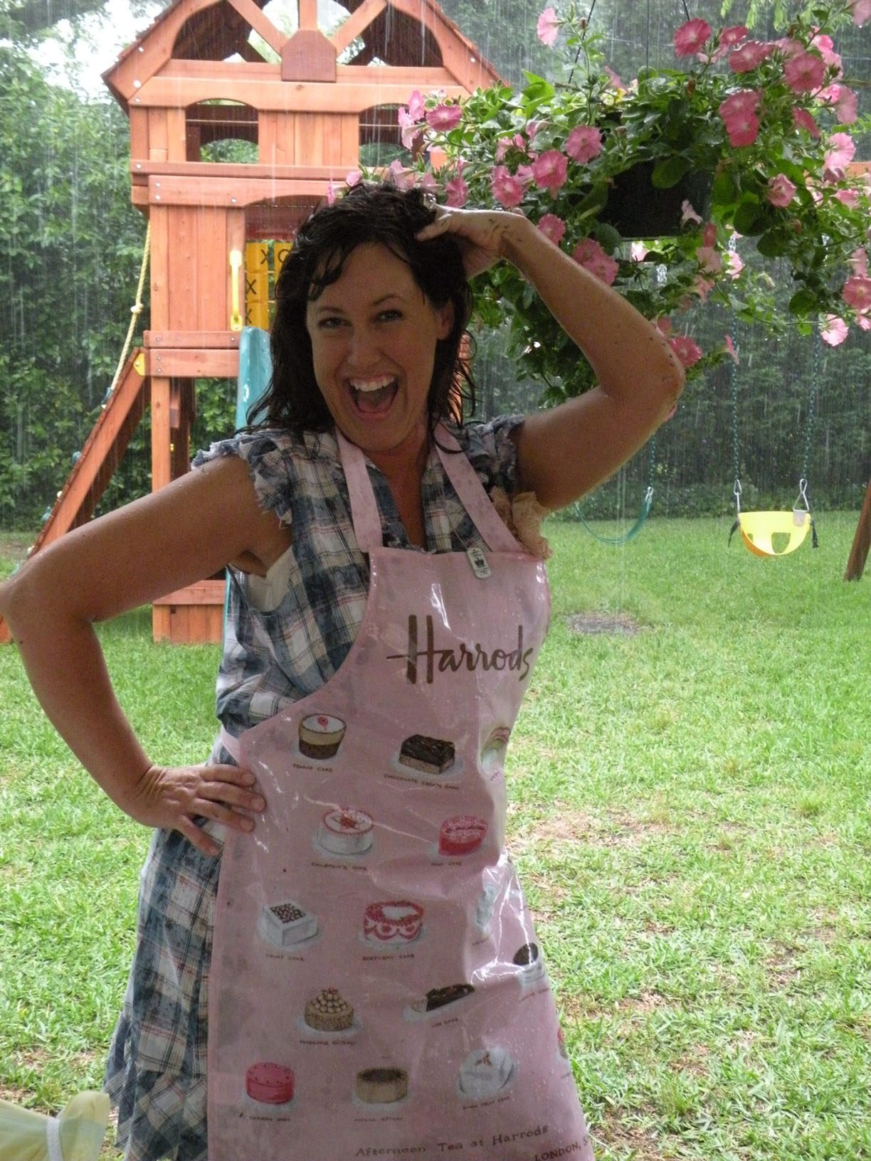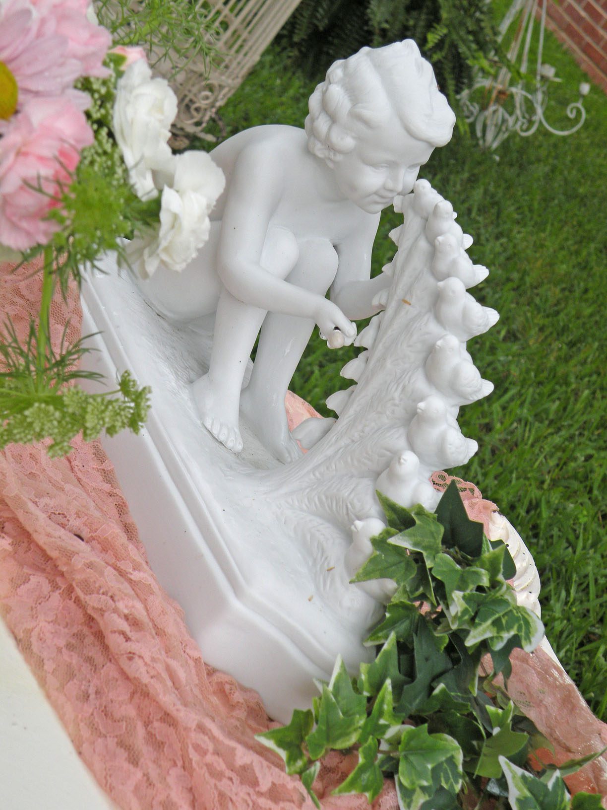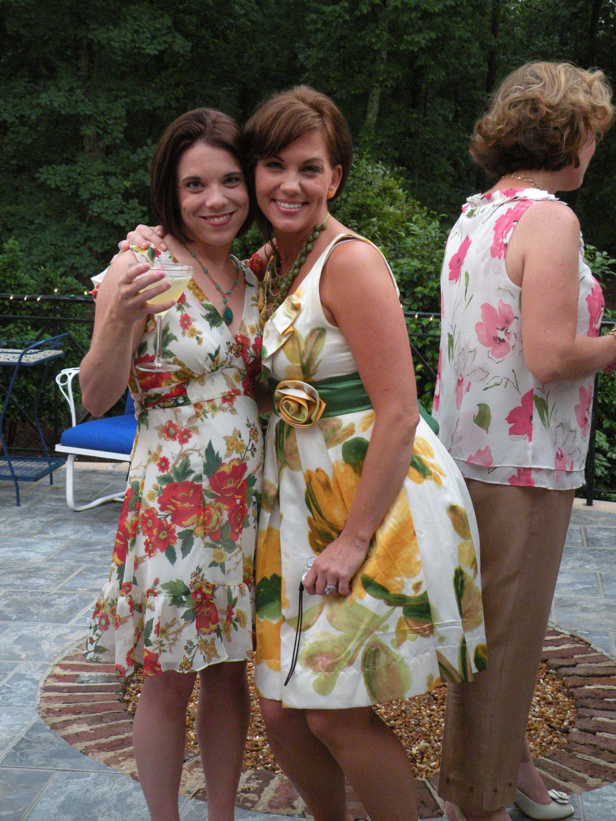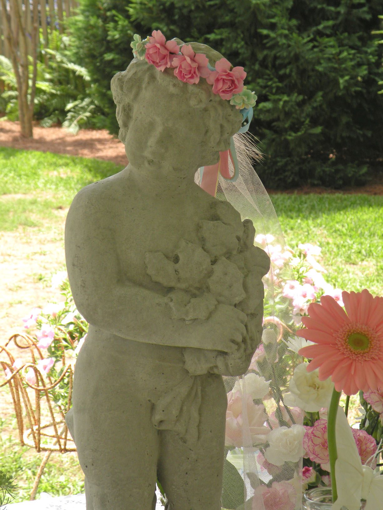 Yummmm!!!!!Cheryl welcomed us girls with open arms and was such a sweetheart to chat with. Goodbye beautiful Savannah!!!! It was a fun ride home. Almost a little too fun to show photos. Let’s just say we were on a sugar cupcake high. 😉 Saturday was the MAIN EVENT!!!! Early noon I hosted a tea luncheon. My Mother and I prepared all the food, and I closed off my dining room to all of the ladies, because I wanted it to be a surprise. I spent much time decorating and transforming my dining room into a dreamy beautiful enchanted garden “feel” for the luncheon. Me and my darling friend Cheryl. My gorgeous Sis Jessi!Darling beautiful friends.We dined outside under the beautiful decorated tent. For many of you that know my artwork it’s all about the DETAILS!!!! So I went ALL out on the details of the decor. Tables were set with vintage floral linens, vintage hankie napkins, white wedding chairs that I coverd with vintage embroidered pillow cases and tied with tulle and silk flowers, cherub statue centerpieces, and beautiful vintage bottles of fresh flowers that I decorated with lace, ribbon, and glitter butterflies.I decorated this old frame with vintage millinery, butterflies, and glitter banner created by the super sweet and talented Madai of Forget me Nots from Wren Cottage.It was a BIG surprise to the girls, but one of my FAVORITE artist is the super kind and creative talent Kris Hurst . She and her lovely sweet friend Marilyn drove down to Macon to help me set up for my event. Kris is in the works of wanting to plan an art retreat close to her home, so she decided she would like to come and help me out and take some notes. 🙂 I commissioned Kris to make me a banner that says “Welcome Flower Fairies”. EEEK!!! Sooooo adorable!Gifts for the flower fairies. I made them each a flower bottle.Andrea hosted a garden swap for us gals and she stuffed all the incredible treasures inside these big beautiful ruffled tote bags she made for us all. It felt like Christmas opening up all the sweet lovelies inside! It felt like an oasis of beauty surrounding us!!!!!Some cute snapshots of the ladies.Andrea and Lorraine who I now call “Miss Pinky” and who always makes me smile!!!Angela and Sherry.The tiniest flower fairy being such the lady!I had TWO surprises for the ladies. I wanted to my retreat and luncheon to have an elegant feel to it, and thought it would be lovely to have a harpist perform. I hired Calista who is an AMAZINGLY talented!!! Her beautiful soft erethreal music really made the event even more special.My next surprise was something both Natasha and I planned. Since she could not obviously be here to attend, Natsha made a “mini me”. We ALL cracked up!!! She looked so lovely sitting in her chair. 😉 tee! hee! Cheryl and I giving Natasha a sip of champange punch. Not too much tho’….we didnt want her getting too tipsy!After the luncheon we had a little Vendor Fair set up. Tons of sparkley goodies!Silly Analise!Georgia Southern Belles!In the corner of my yard we set up a beautiful outdoor sitting area.Moi. 🙂My incredible birdcage that I just found a few weeks ago.You NEVER know what’s going to happen in this crazzy Georgia weather. Once we got started working on our projects. It proceeded to rain!!!! Thank heavens for the tent. We all huddled about and worked regardless of the short downpour. The rain NEVER once dampened our sprits!!! As you can see Miss Tiffany and Karla thought it would be fun to slide down my childrens slide in the rain. We we ALL laughed hystarically! Such a cutie even when soaking wet!Everyone kept working while it was pouring rain, and we chatted and laughed the whole time. The completed projects ALL turned out sooo beautiful and unique to the artist personality and style!!! Tiffany and Andrea’s gorgeous flower pots.Tiffany’s stunning flower pot filled with flowers.The girls REALLY LOVED making the fairy ball ornaments.Miss Karla’s.Cheryl’s sweet little wee one.Kim’sThis darling little fairy ball has twinkling lights and is made by one of the kindest and sweetest ladies Rosalyn-Sue.Im simply amazed at how everyone’s projects turned out. Im still “pinching” myself that I taught my first class!To end our FABULOUS weekend, we all dried off and rested afterwards, than later on got all “dolled up” for a garden cocktail party hosted by one of my dearest friends Suzanne McCrone. She had a beautiful spread of food and cocktails!Andrea, Tiffany, Suzanne, and Lorraine.Suzanne’s husband Reg really knows how to make a yummy cocktail!Some fun snapshots of the ladies.Such pretty ladies in their floral dresses.After hours of talking, bonding, and laughing so hard that our tummies hurt we finally called it a night at 1am. Sunday rolled around and it was time for the girls to pack up all their pretties and head home. It was sooo bittersweet! I’ve enjoyed spending more quality time with my old friends and bonding and getting to know my new friends. Needless to say I was one EXHAUSTED girl!!! LOL!!!! The weekend could not have been more perfect and more beautiful!!! I felt so inspired and creatively rejuvenated by being surrounded by these super talented women! I can’t thank you ladies enough for attending my first event and making it a HUGE success!!!! I want to end this VERY long post (thanks for hanging in there!) with a painting the uber talented Karla painted that sums up some really funny (inside joke) moments.Pictured is me as Queen Flower Fairy, Tiffany going down the slide, Lorraine sitting pretty in her chair, Carol with a black eye (long story! LOL!), Jessi with her pretty pointed toes, Cheryl standing on top of cupcake, Analise giving homeboy peace signs, and Andrea and Kim showing ABC flashcards. Thank you ladies for the memories…. I will cherish this weekend forever!XOXO,