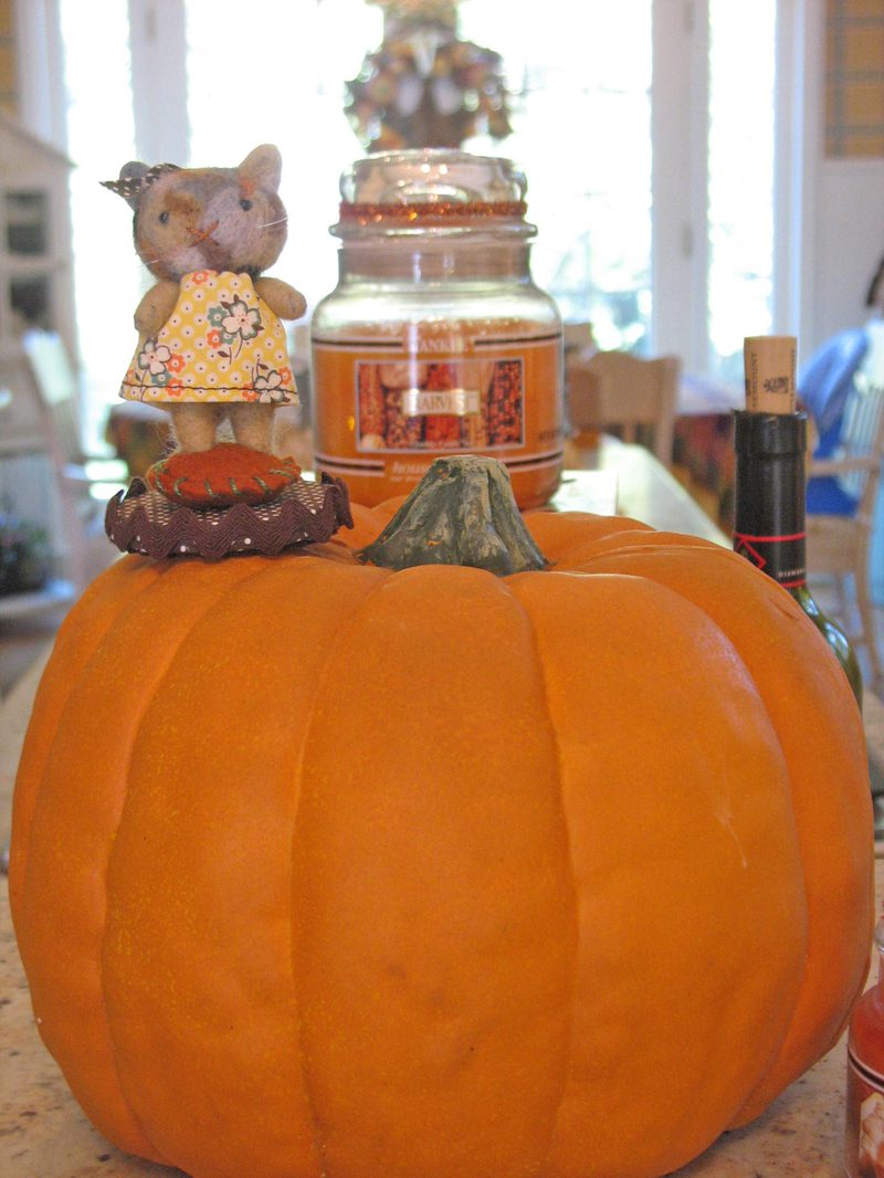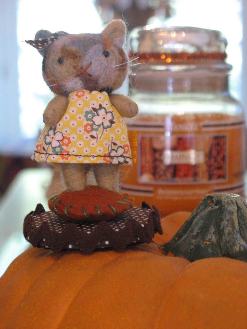 This is Miss Odelette the Calico Kitty. She is handmade by the FABULOUS artist Jennifer Docherty. Odelette is sooo sweet and is wearing the puuurfect Fall wardrobe. I just had to show her off on this pumpkin. ๐
