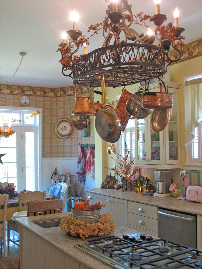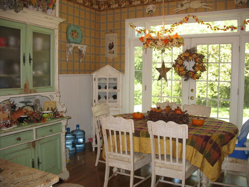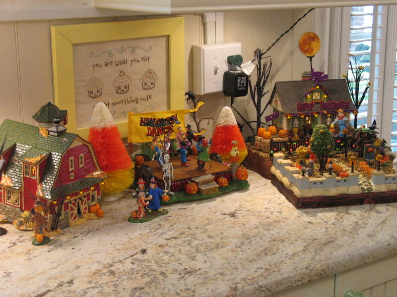My first topic of the day is FALL!!!!!!!!!!! WOW! I can already feel the temprature drop and the humidty FINALLY leave us slowly. Which means BETTER hair days for me! LOL!!! Ok…After reading my Oct issue of Country Living magazine yesterday I was TOTALLY inspired to get off my butt and decorate my home for Fall. Not many of you know, but Im having surgery tomorrow (Tues), and my recovery will be pretty long. No heavy lifting for 12 weeks. EEK! That includes my KIDS!!! AAAuughh! Anyhoo, so I knew that I needed to drag out all my decor from the basement and get busy while I had the energy. Thank heavens I did. Im thrilled with how my kitchen turned out. Warm, cozy, and oozing with Fall and Halloween spirits! You will see several pics of my Department 56 Halloween Villages that I’ve been collecting for 6 years now. What you will see is only HALF of what I own. I usually set up a HUGE display in the front window of my Living Room for all the kiddie poos to see, however it takes DAYS to set the whole village up. Well, I dont have that much time, so I pulled out a few of my favorite pieces and displayed them on my kitchen countertops.