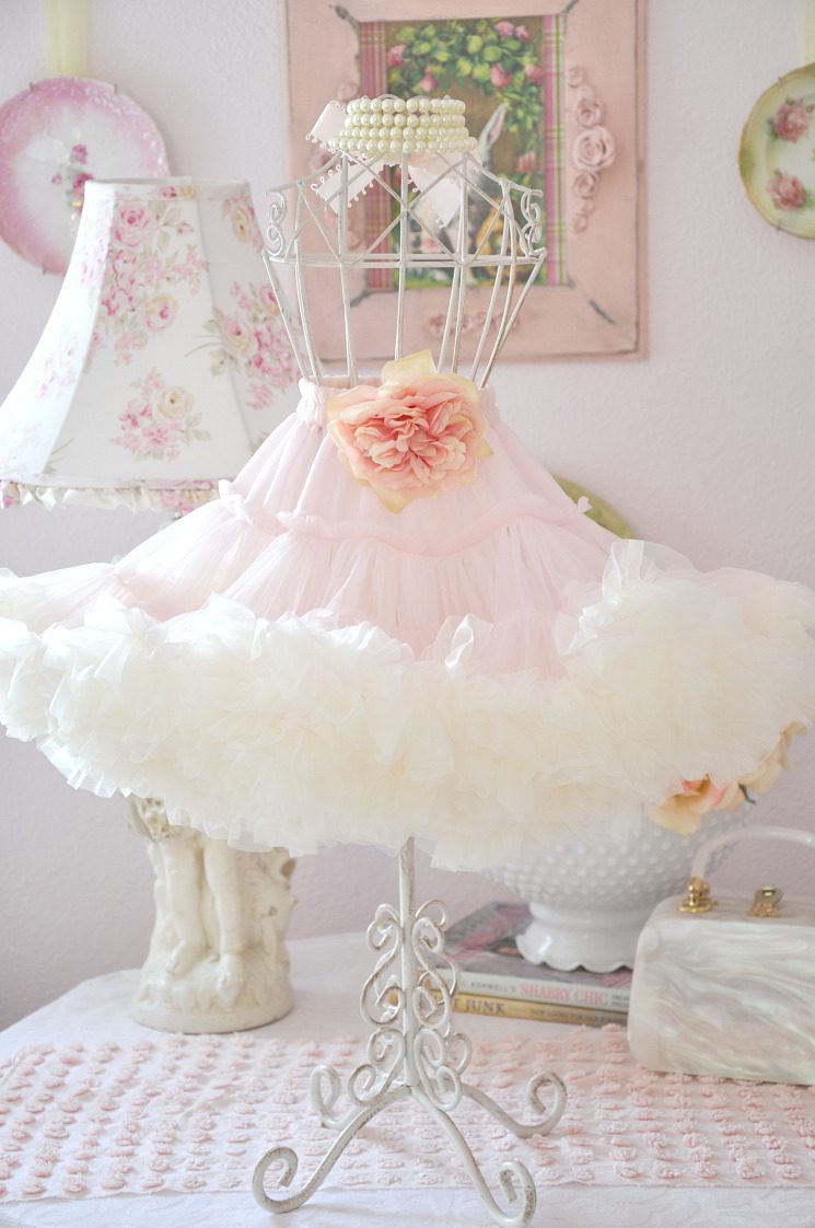 Last but not least….a beautiful table dress mannequin with frilly petticoat. I used these beauties on my tables at my event. They look so pretty on a dresser!