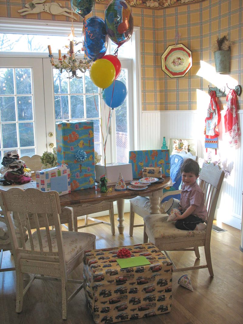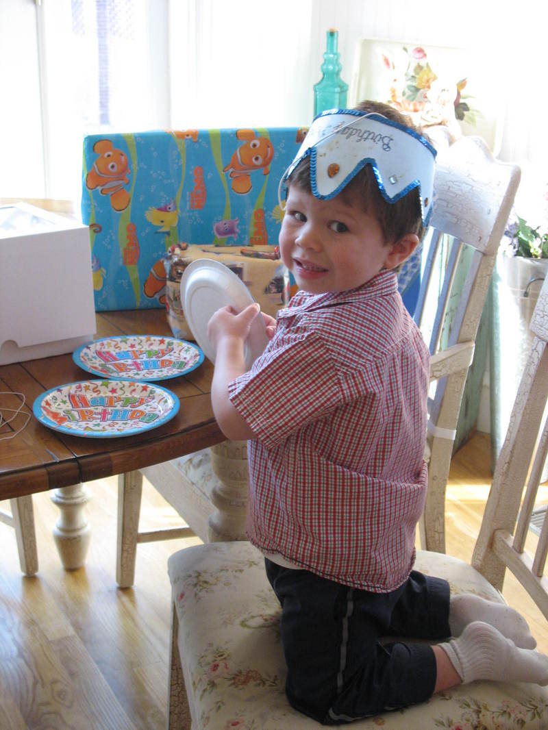 I surprised him after preschool with balloons, gifts, and cake. Of course we have to wait for Daddy to get home before we open gifts and eat cake. He was soo dissapointed. It was killing him to have to wait for Daddy to get home from work. Here he is waiting and waiting….. He RARELY left the table!