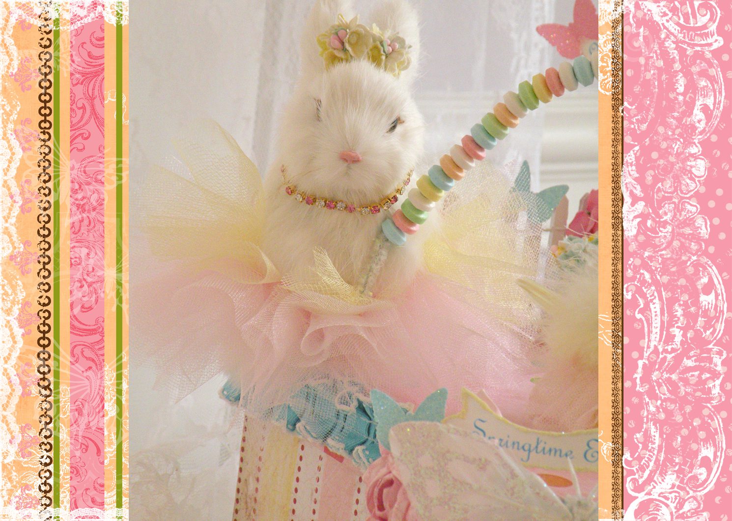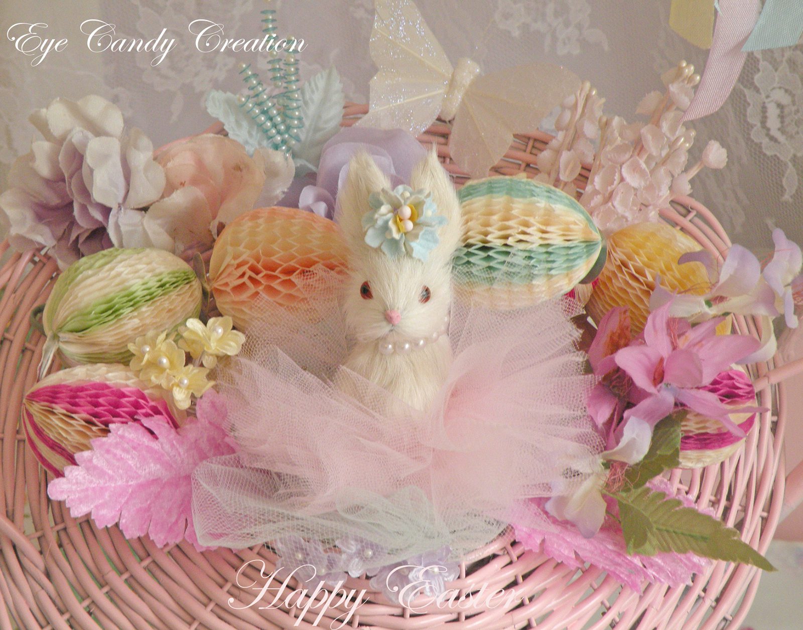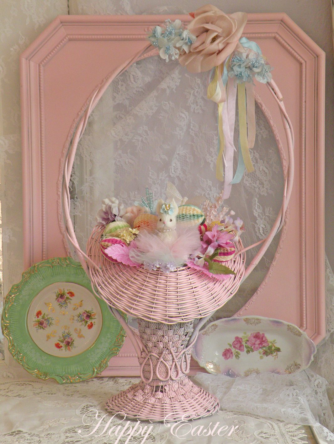 I filled this vintage basket with tulle, millinery, vintage paper easter eggs, and my sweet signature bunny.
