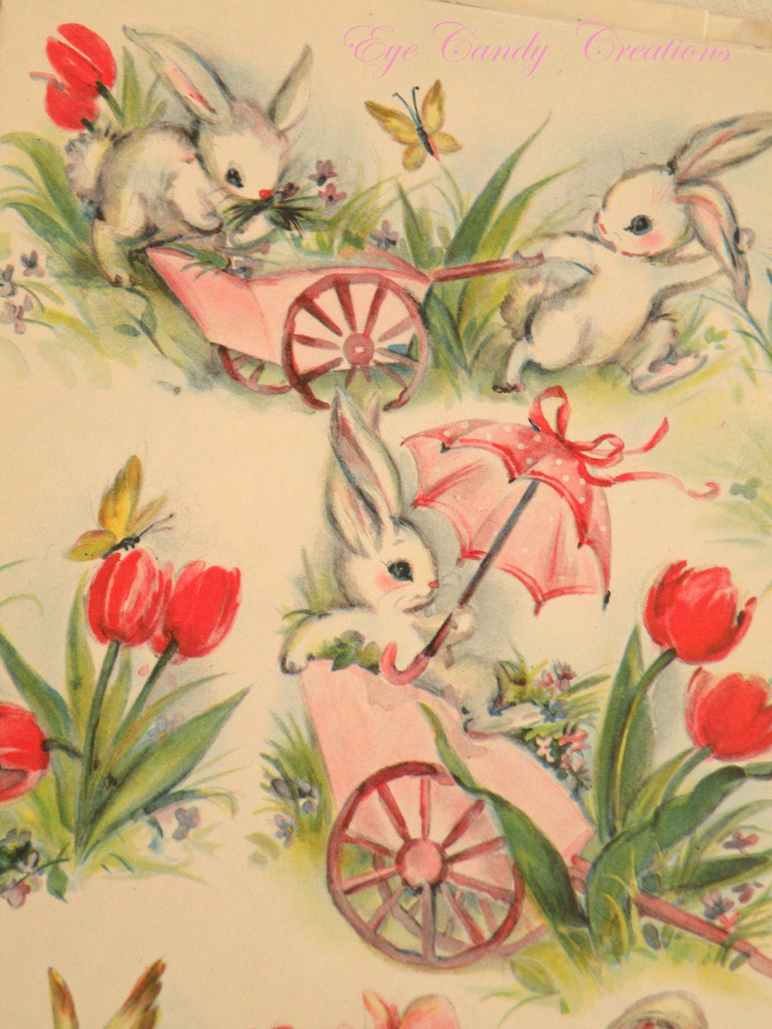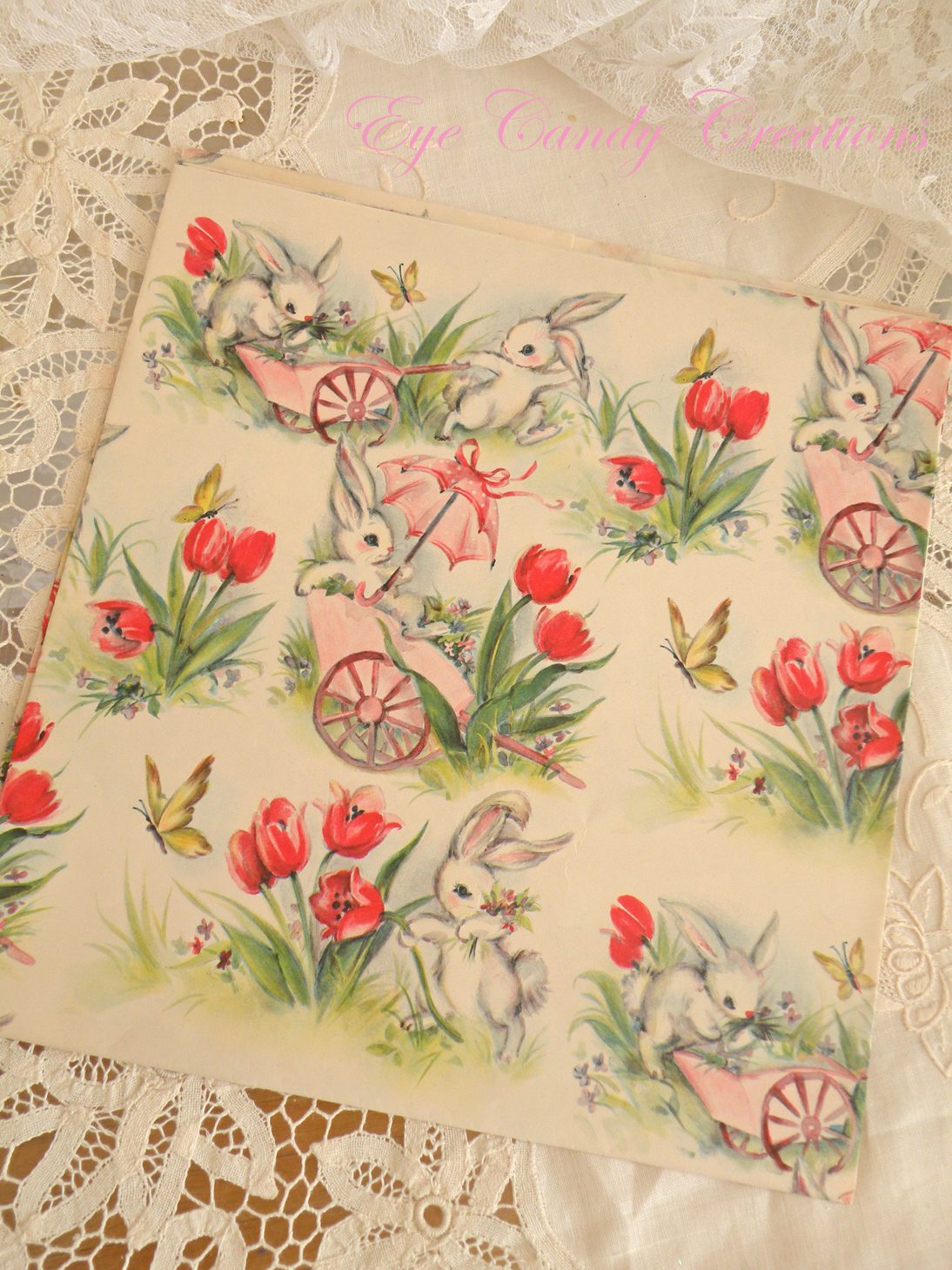 I've been collecting vintage wrapping paper for my En Le Jardin event, and I found this cute paper with bunnies all over.