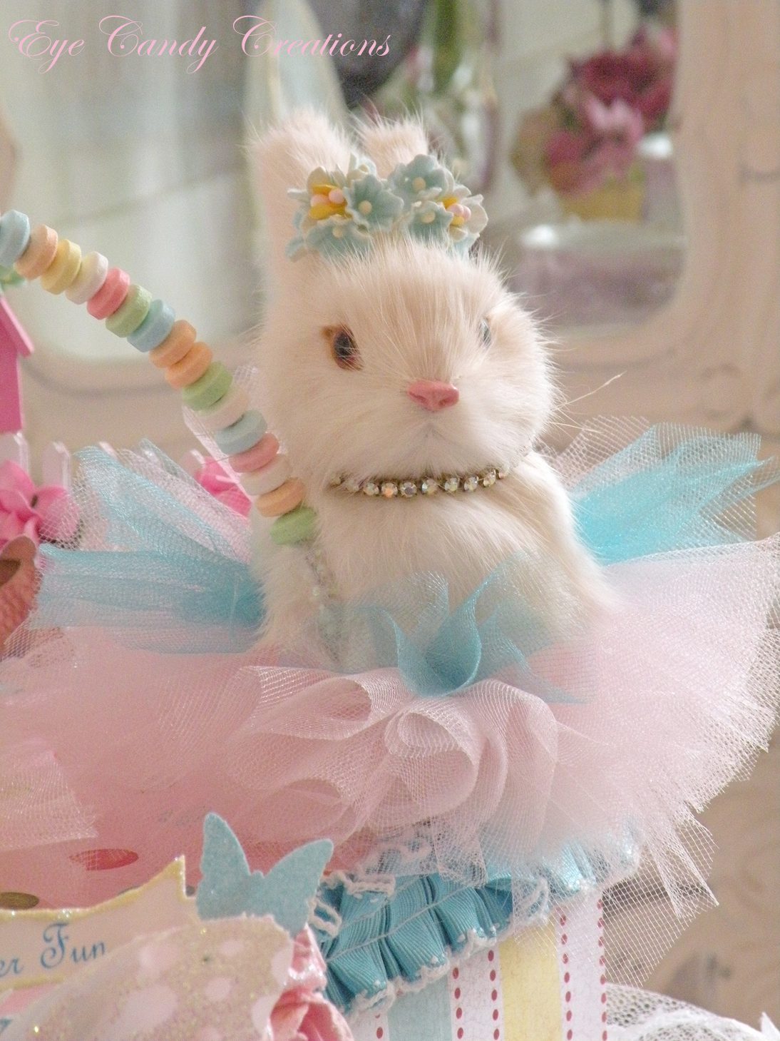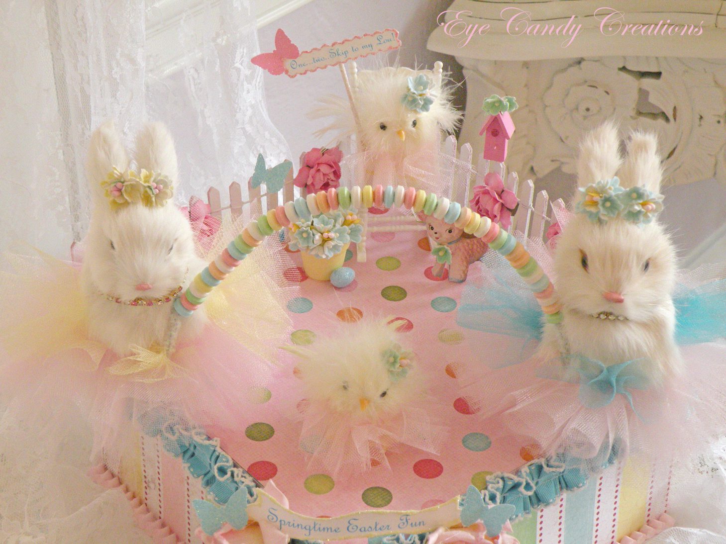 This commissioned Easter bunny box titled "Springtime Easter fun" is for a special young lady who lives in Australia and is truly my #1 fan. Her Mom wanted to surprise her Easter morning with a bunny box made especially for her daughter. This sweet little girl emails me all the time and praises my work, and is always wishing to own one of my pieces. I was very excited to make this and so I put lots of extra "childhood fun" and sweetness into this piece made just for her!