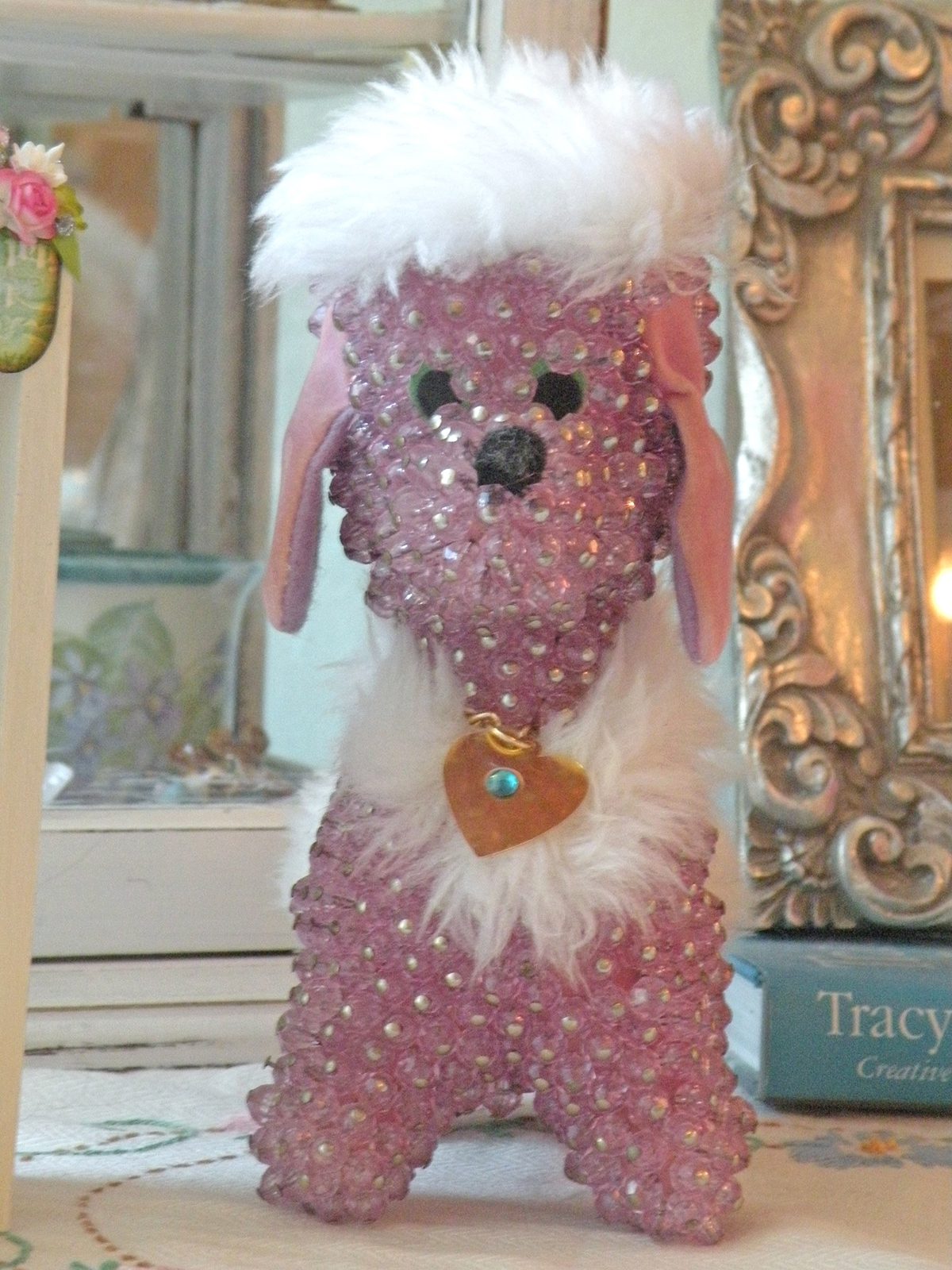 Welcome sweet friends! I have a MAJOR confession! I am an addict!!!! My addiction is collecting. I collect all SORTS of things!!! Vintage jewelry, figurines of all sorts, hats, dresses, china, anything that OVER THE TOP CUTESY! Take for instance this darling beaded poodle dog. Have you ever seen anything like it before? I haven't. It instantly became an "aawwwww that's soo cute I must have!!!" My obsession is starting to overtake my house. I have NO room for all these pretty and fun objects. The figurines especially. I dont mind "some" clutter, but Im now noticing things are taking over. LOL!!!!