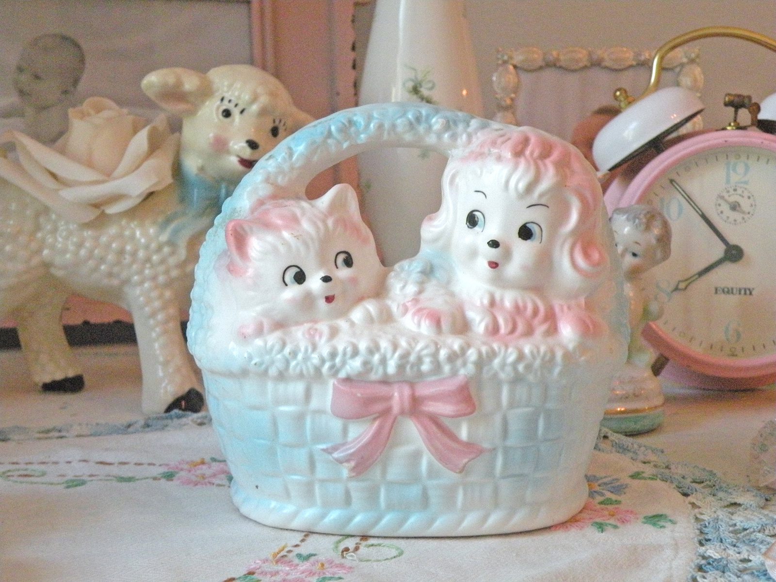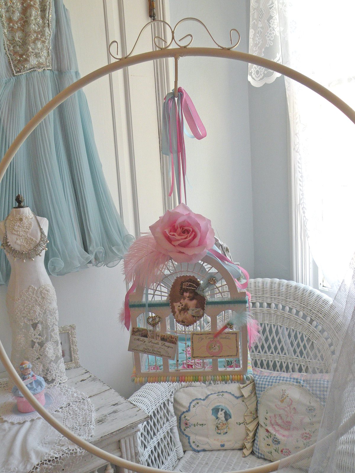 I love your birdcage and the lace candle holders. The last one with the baby on it,