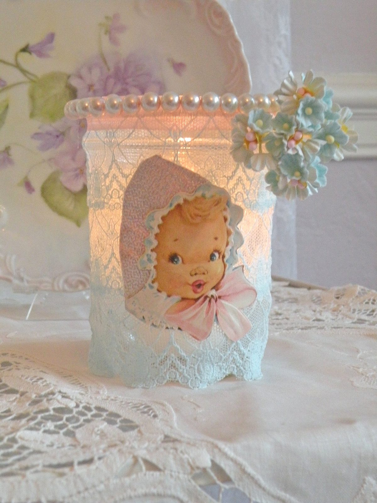 I must do your online retreat if you offer it again. I just had too much to do with halloween around the corner. Your candle vases are just wonderful. I love the glow through the lace. The baby one is precious too!