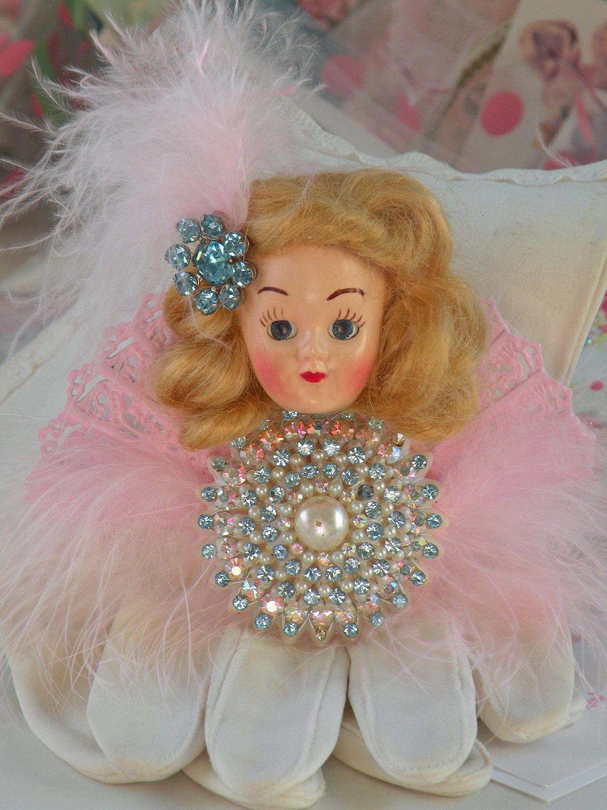 My Silver Bella edition vintage doll head brooch that I made to wear. Her name is Miss Bella.