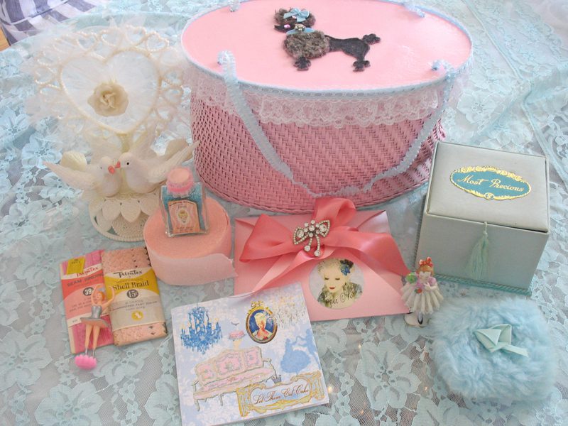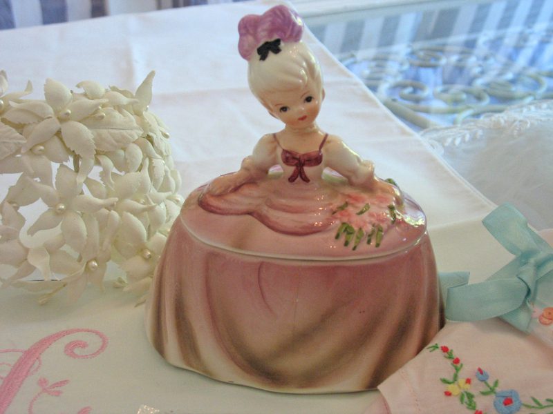 I love all the Junque you gave and received. The powder-puff china doll is so darling. My mom use to have one on her bureau when I was a little girl. I use to open it and blow at the Heaven Sent” powder she stored in it. BTW…Your bangs look great!