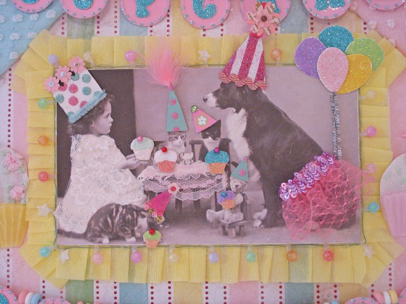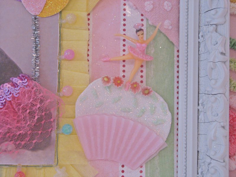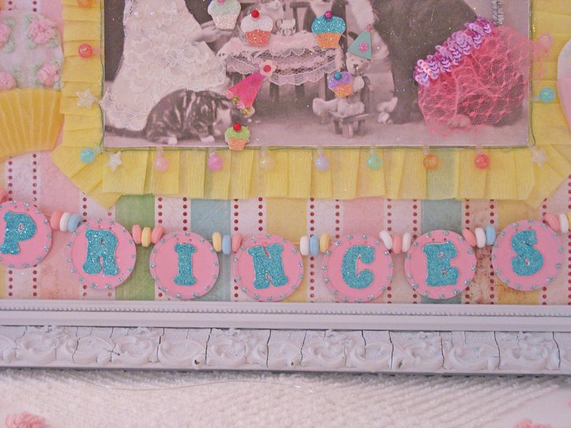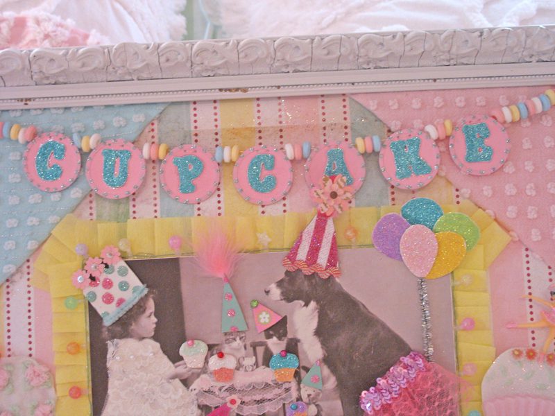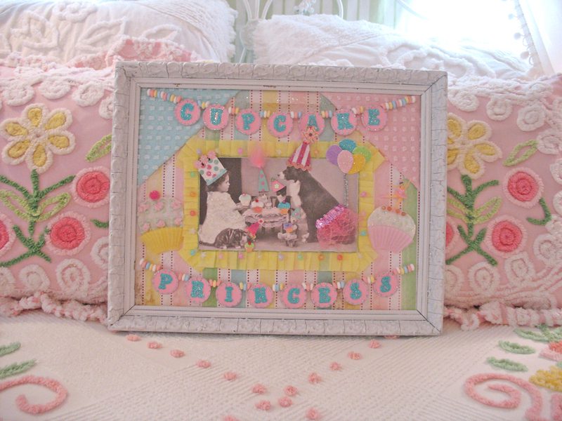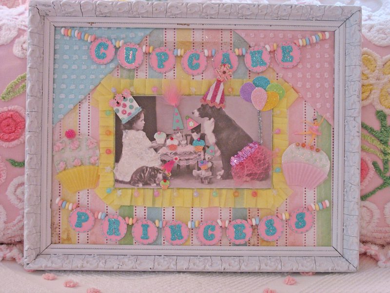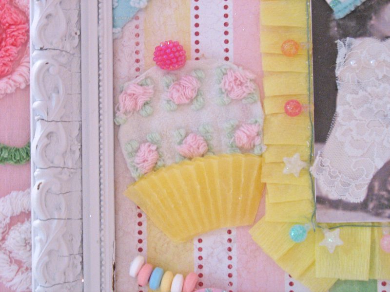 Hello my blogging gal pals! Grab a toothbrush! This is going too be toooooo sweet for words! Actually call your dentist and make an appointment. You might get cavity after seeing this. hee! hee! I decided that after creating Rosanna’s shadowbox, that I loved the overall theme and colors, and decided to make a framed collage similar in idea and style. I think it turned out pretty darn cute! I purchased an old frame and painted it white. The collage itself has allllll sorts of goodies. Lace, glitter, candy,faux pearls,ribbon, chenille, just to name a few. This sweet treat will be available for purchase at my Etsystore. Thanks for looking! ๐ XOXO