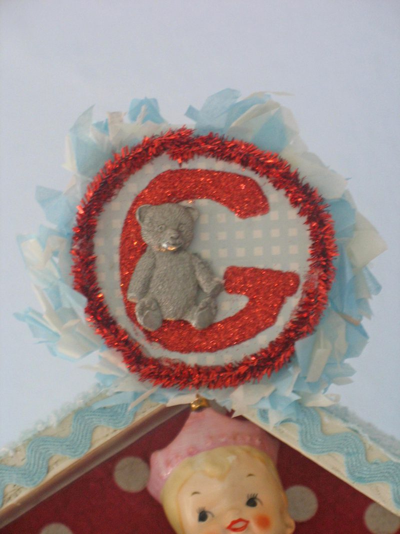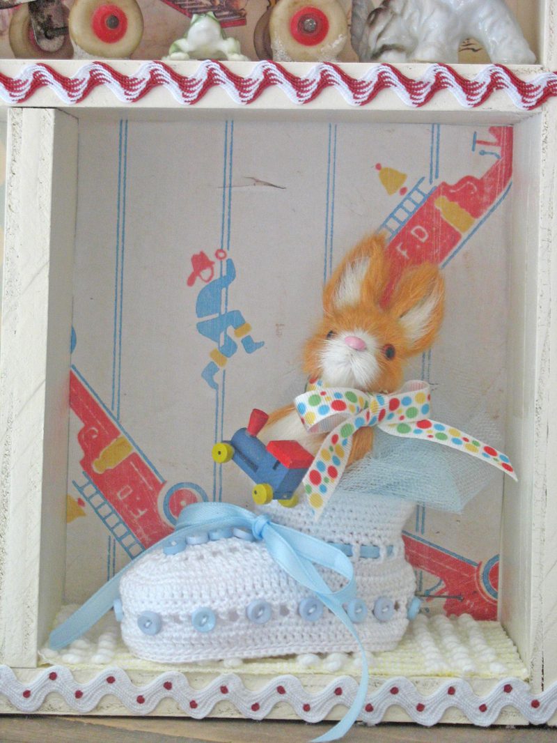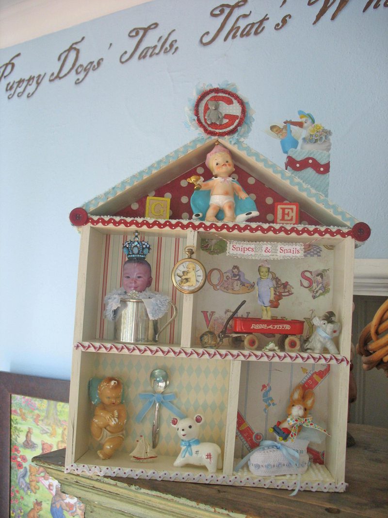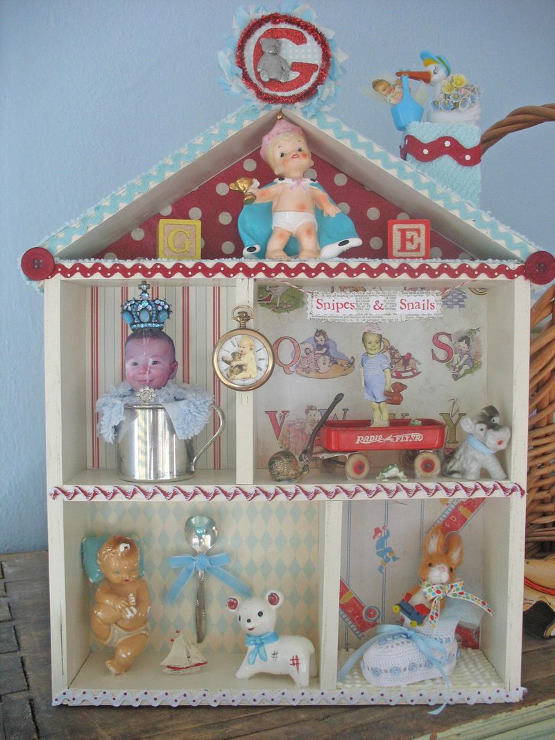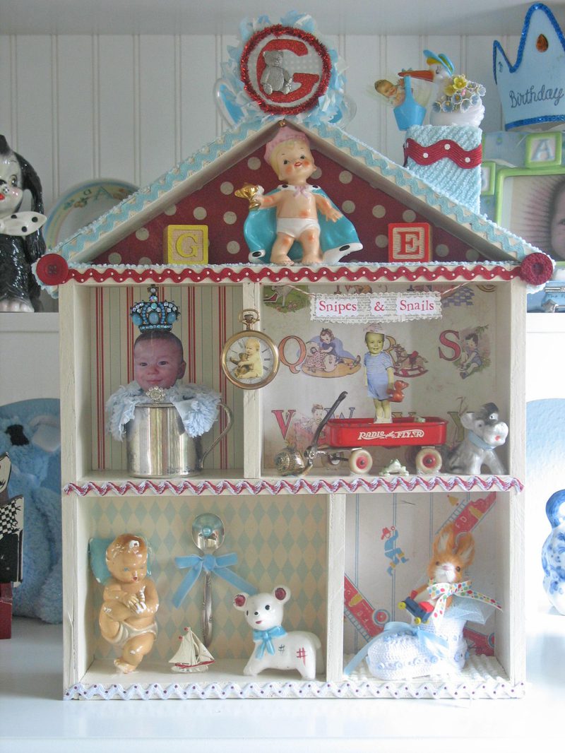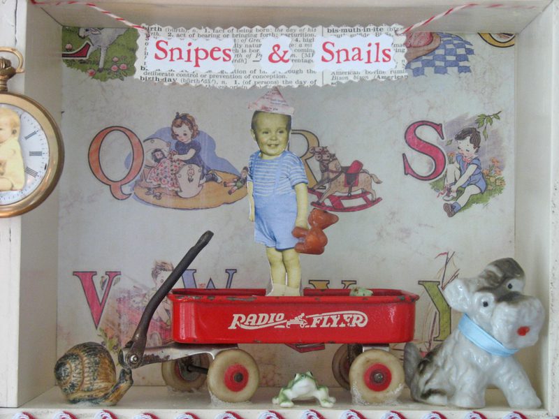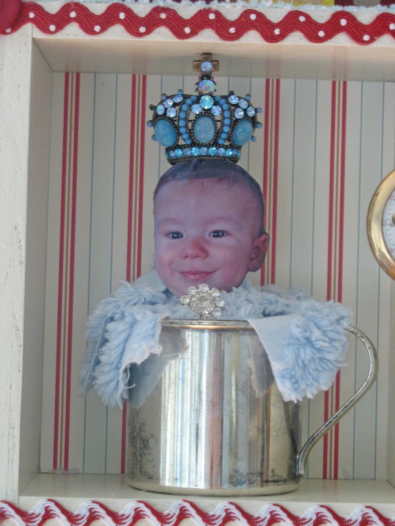The shadow box is so precious. You added really wonderful elements to capture a little boy. I love the vintage china dog, snail and frog! Where ever did you find that blue jem’d crown? It’s stunning.