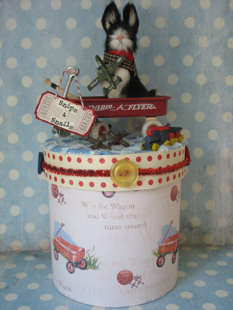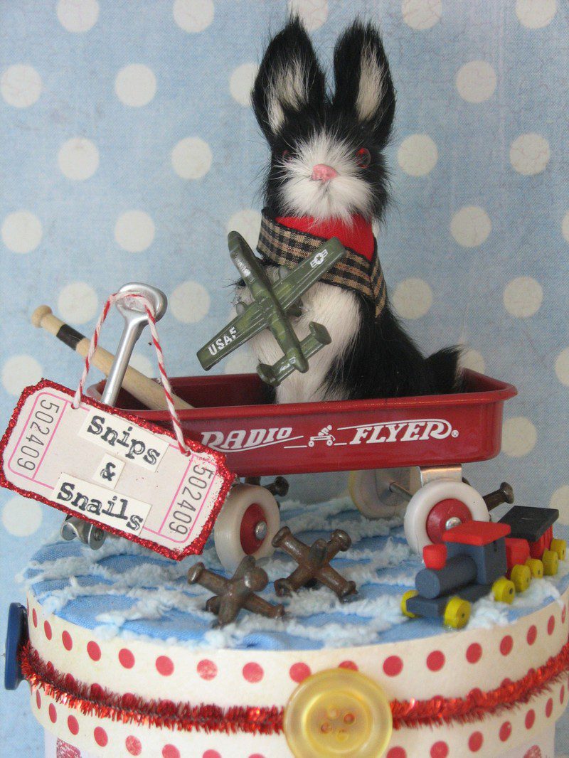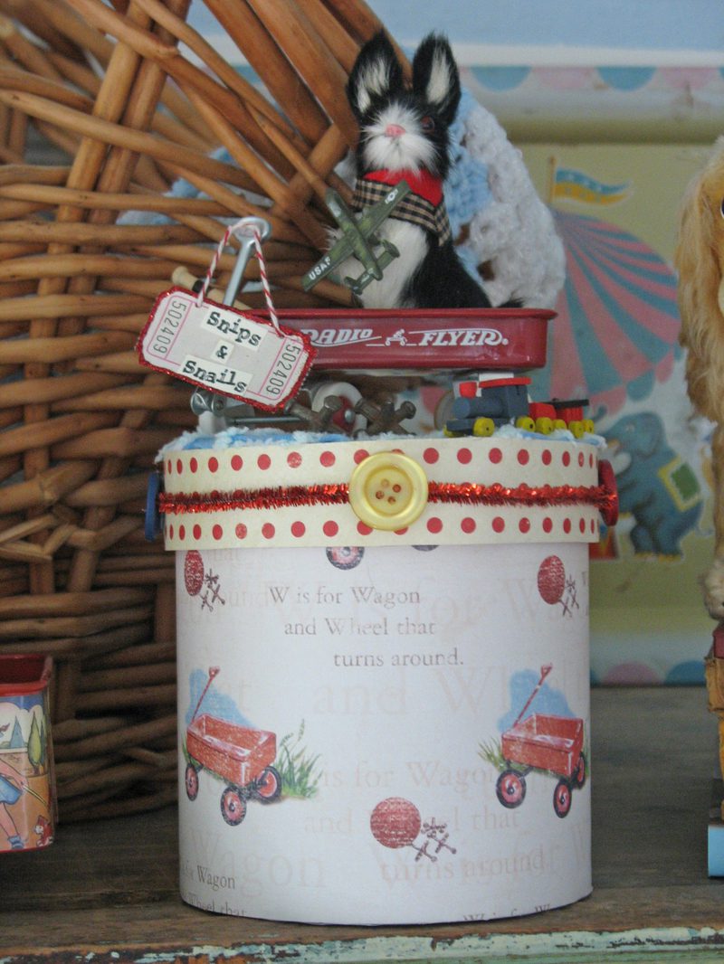 Ok, as much as I LOVE feminine girlie bunnies, I also have a little boy and know that BOYS must have cute decor for their rooms as well. ๐ So, I decided I MUST make an adorable boy bunny box. This has a real sweet vintage feel to it. It’s titled "Snips & Snails".