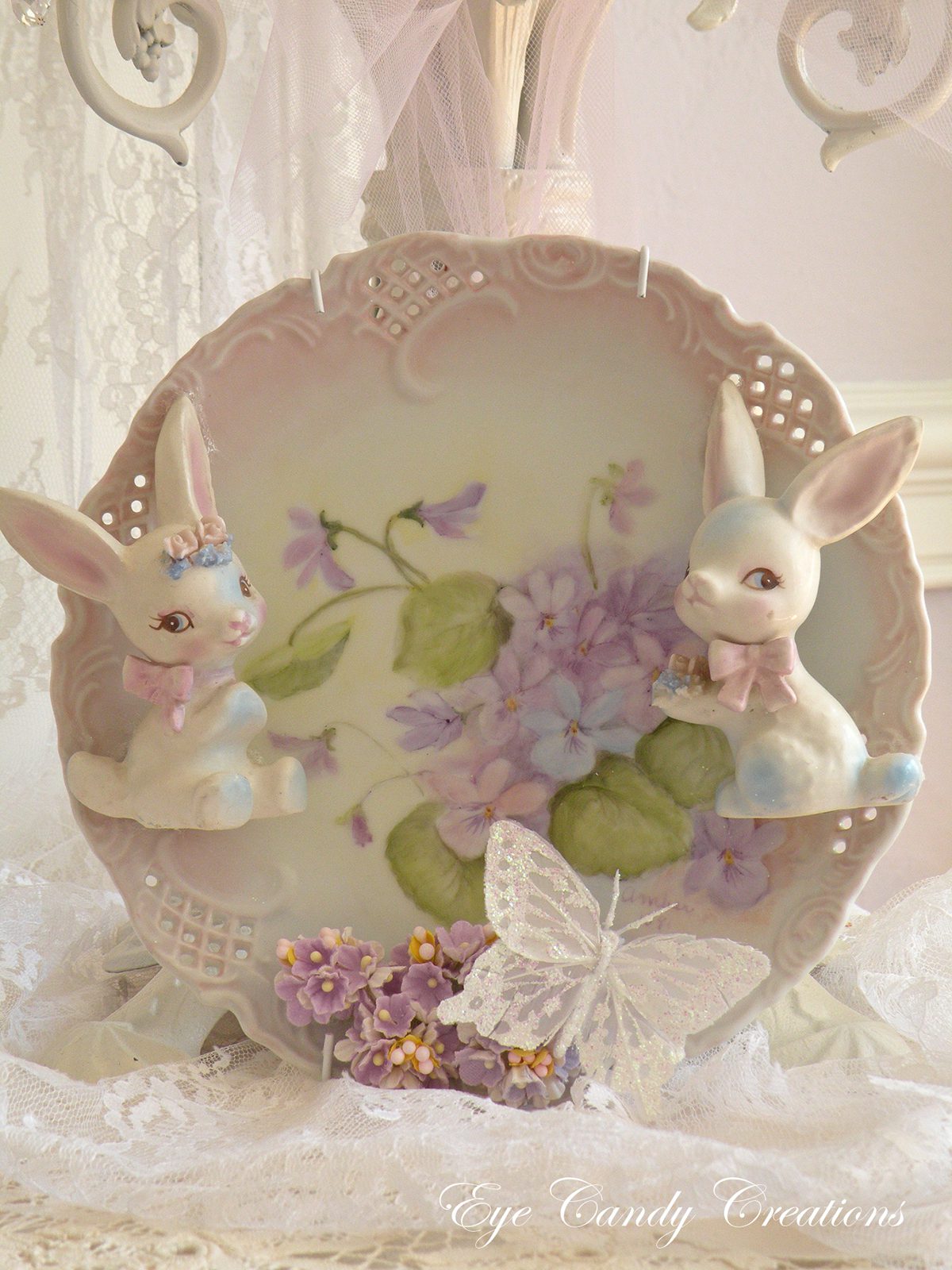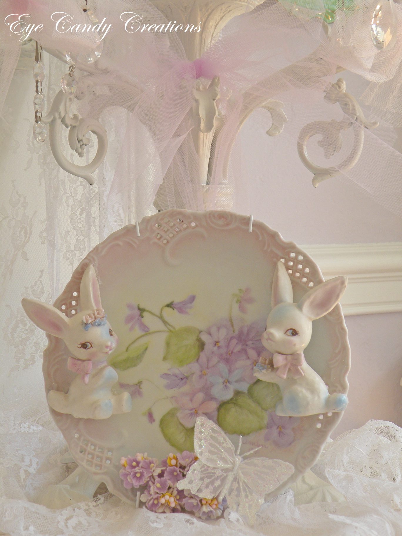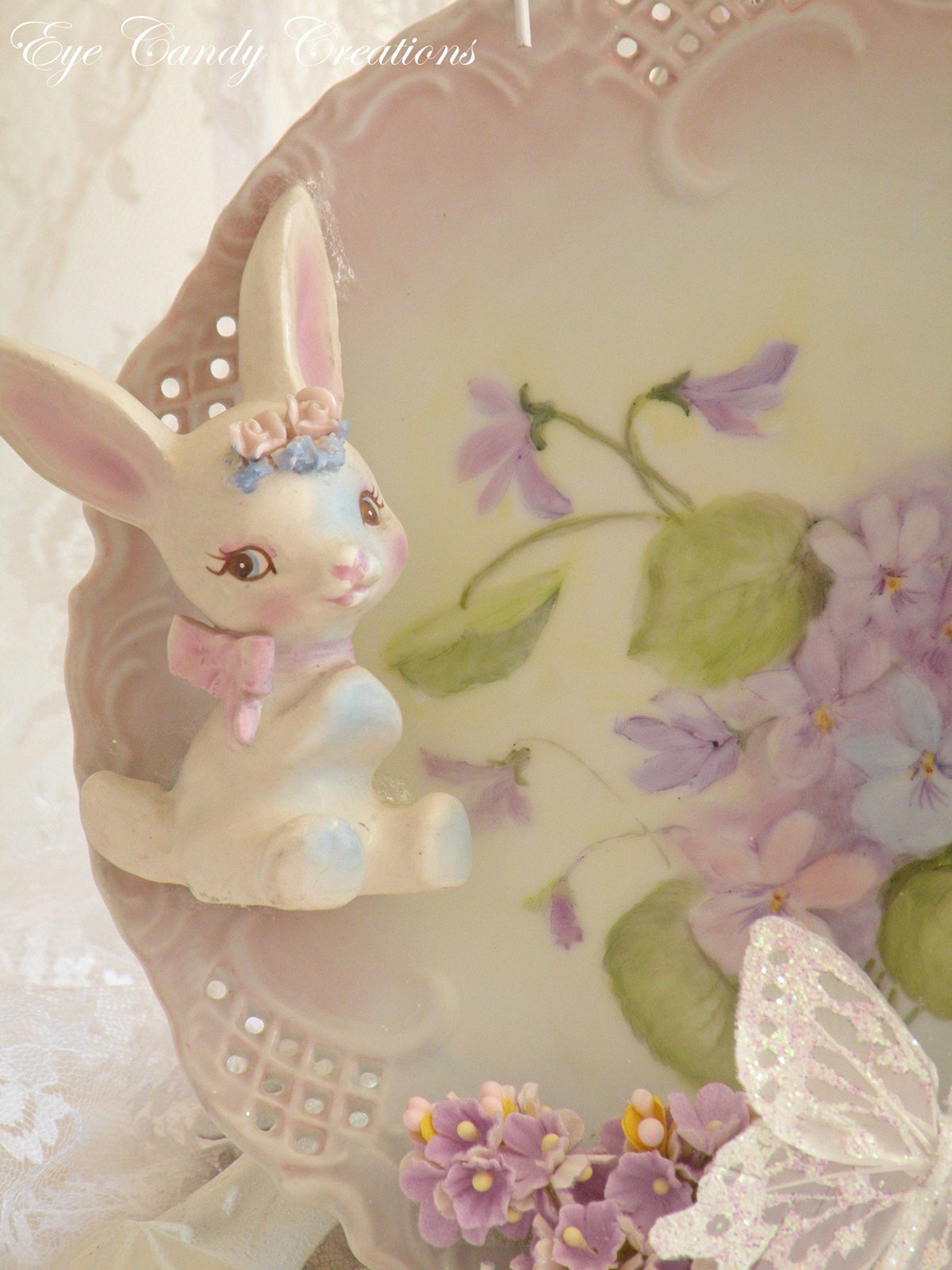 Springy porcelain pink and lavender plate adorned with Lefton bunnies.