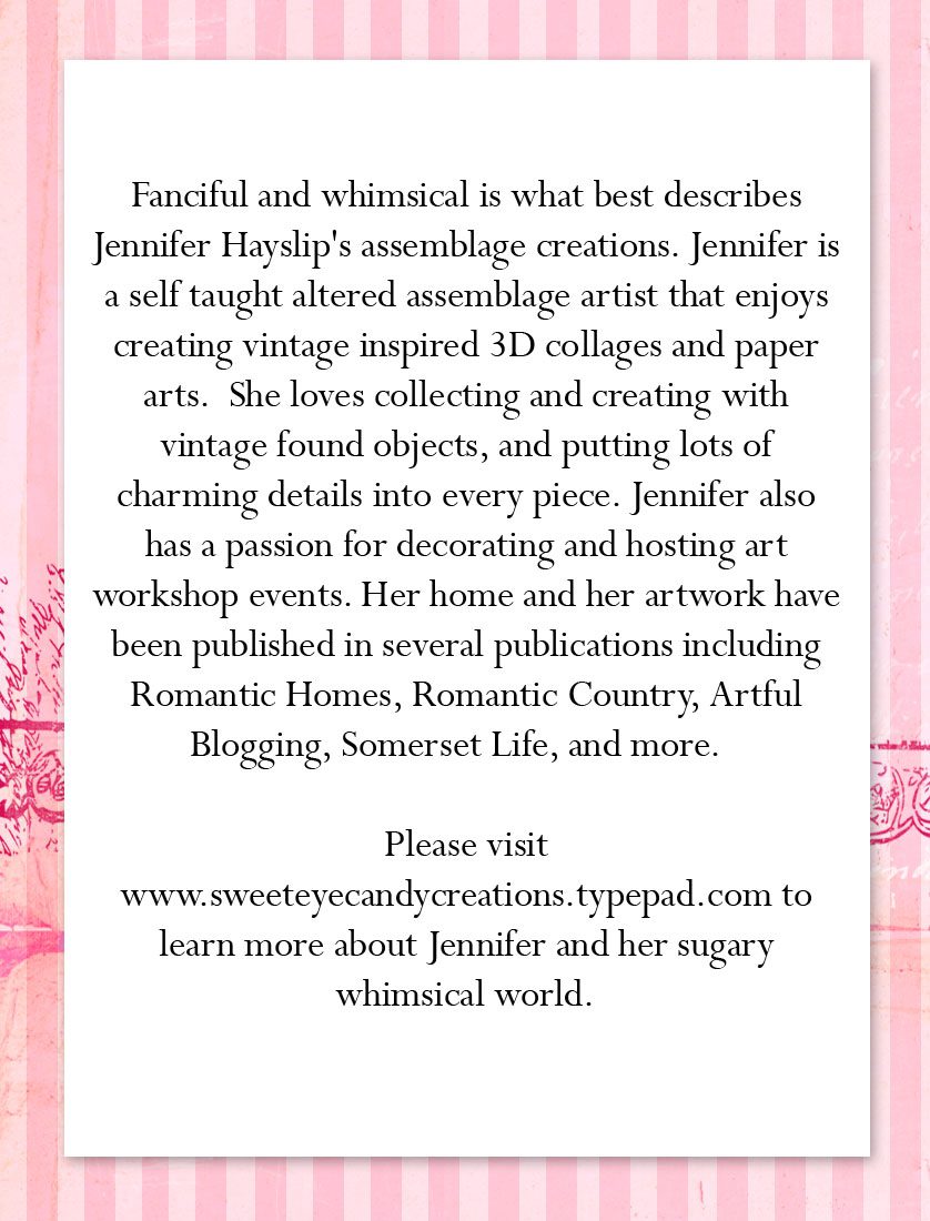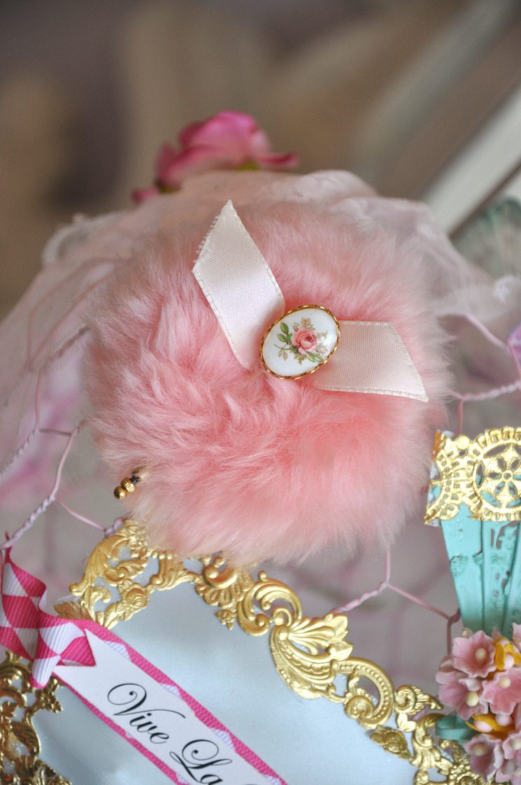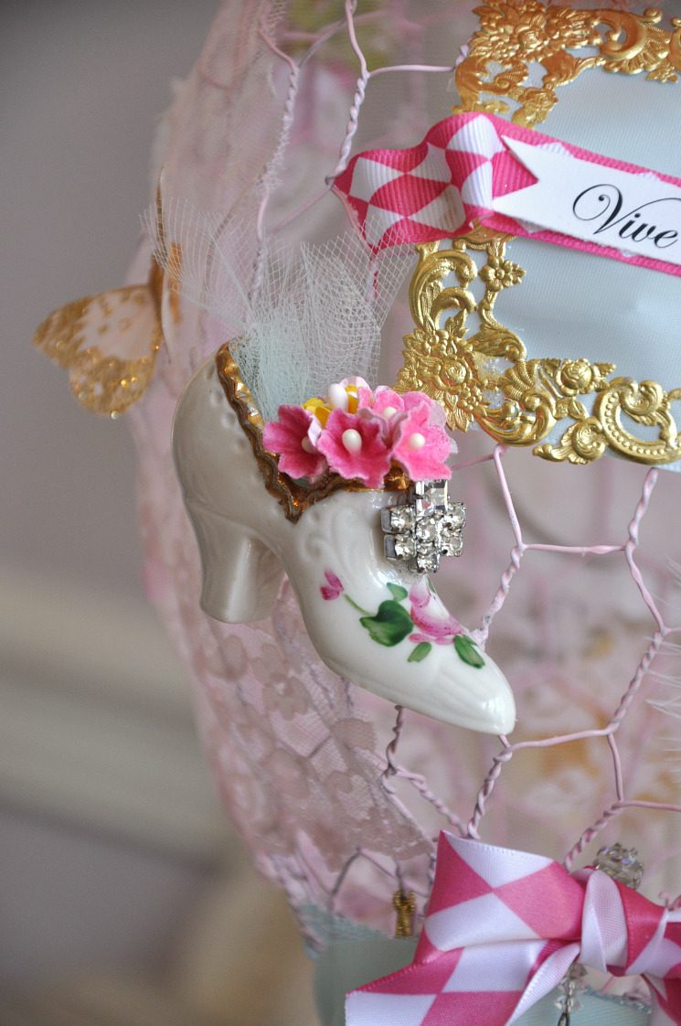 Hey Jenn, I just wanted to tell you how your creations are getting more and more beautiful. I love the details on this wire balloon creation, like the pink powder puff with the rose pin, the little shoe with rhinestones and millinery flowers and the little gold mask. I also love the pink hair on the little powder tin girl and the purse… charming is a very good word to describe what you do! I love the little details! A very happy Easter to you and your family sweetie!